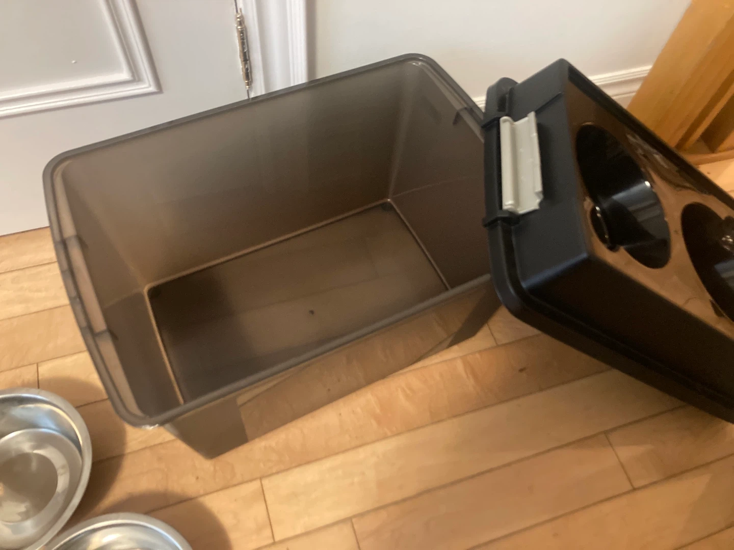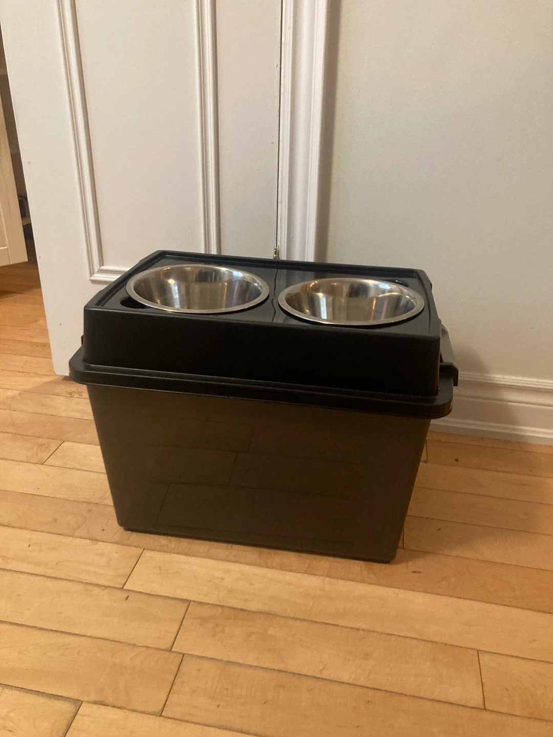 Selling an IRIS USA elevated dog bowl set! It's in great shape and comes with two removable 1.9L stainless steel bowls. The container provides airtight pet food storage, holding up to 45lbs of food. Originally bought for $80.47