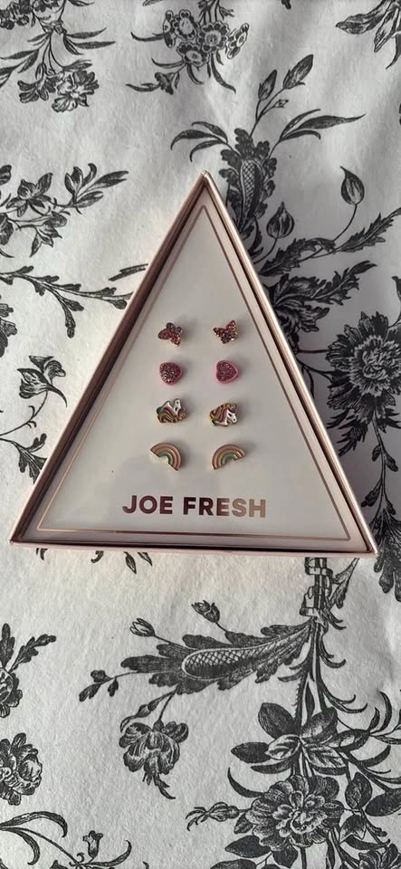 4 pair Earrings for girl/tween. Unopened box contains Butterflies, Hearts, Unicorns and rainbow earrings. In a Christmas tree shape. Perfect for a Christmas gift. Pick up in St James. Cash transactions.