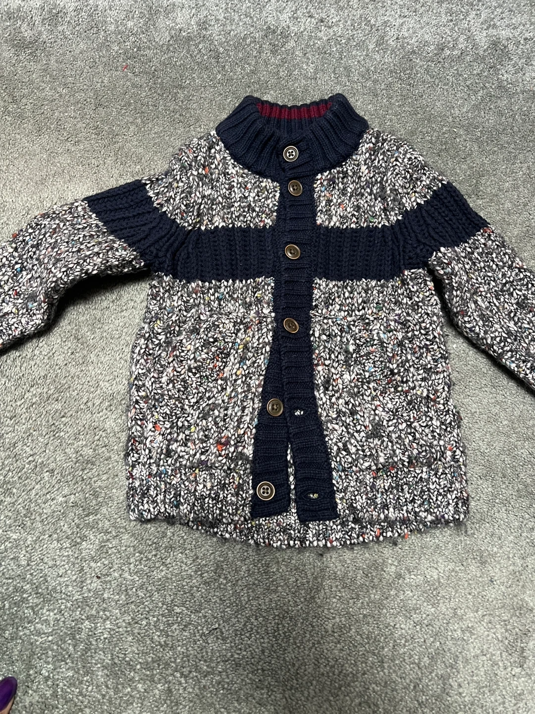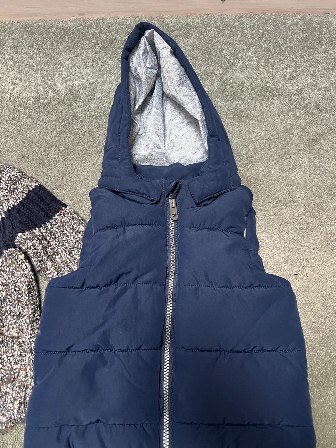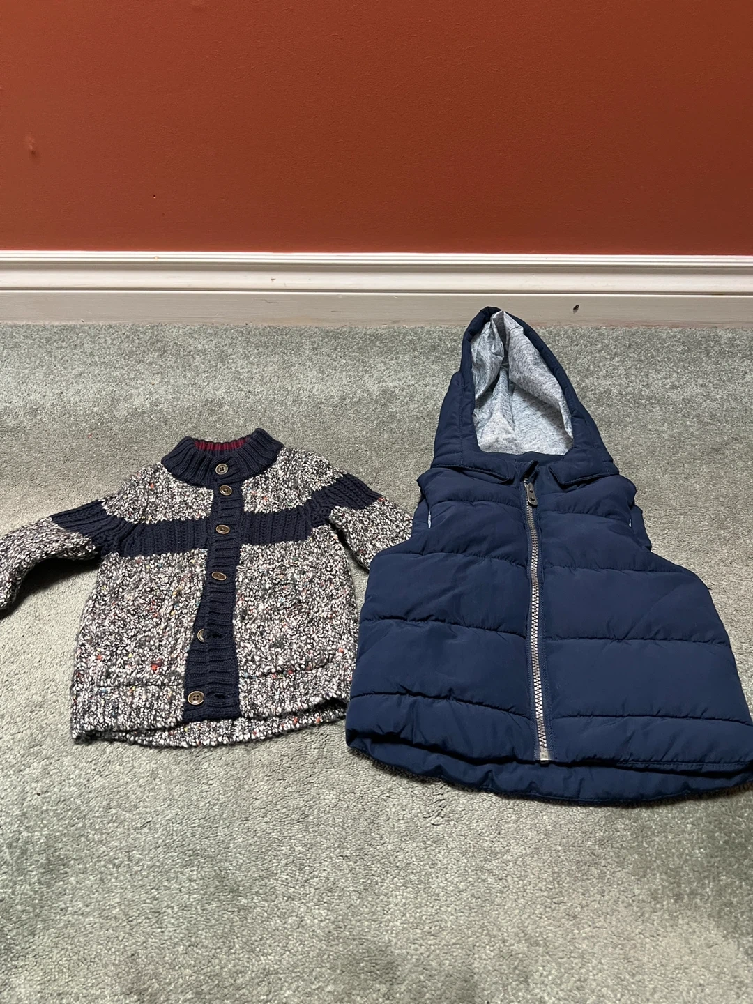 This is a Tommy Hilfiger baby cardigan and an H&M navy puffer vest. The cardigan is size 12 months and made in China. It's a great layering set for cooler weather! The proper list is size 12 months to 18 months. Items come from a pageant smoke free home. Port Union/401/Pickering for pick up. The price listed is for both items.