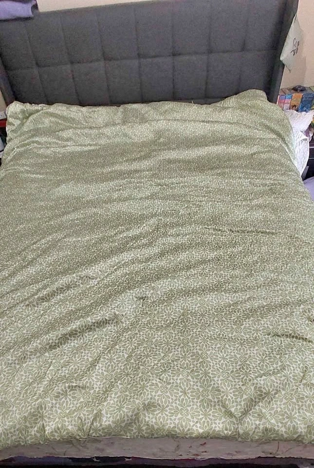 Bright and cheery summer weight double/queen comforter. Pretty green and white pattern, lightweight. Was used in a child's bedroom, no longer needed. Smoke-free home. Shown on a queen-size 6'x6.5' bed. Pick-up in Langford near Happy Valley Road. Cash only please.