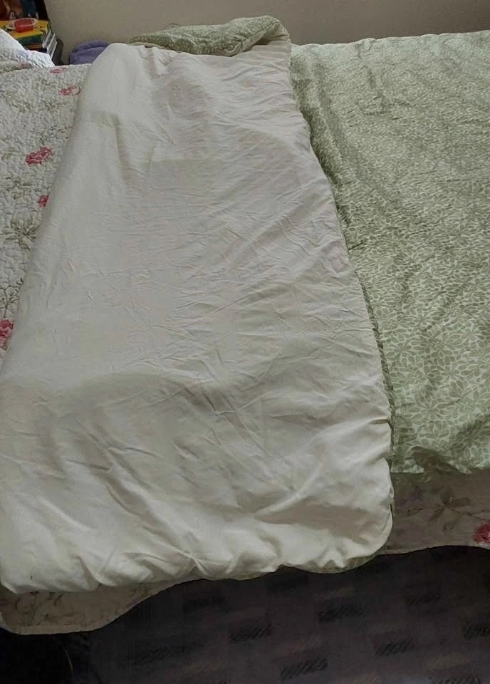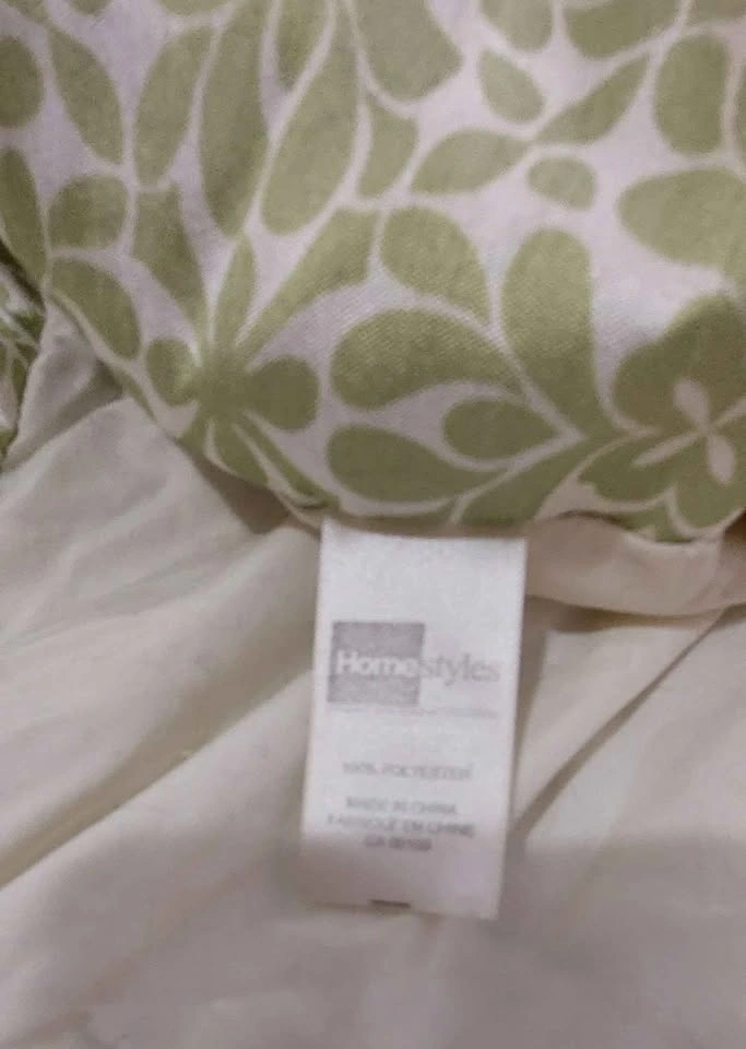 Bright and cheery summer weight double/queen comforter. Pretty green and white pattern, lightweight. Was used in a child's bedroom, no longer needed. Smoke-free home. Shown on a queen-size 6'x6.5' bed. Pick-up in Langford near Happy Valley Road. Cash only please.