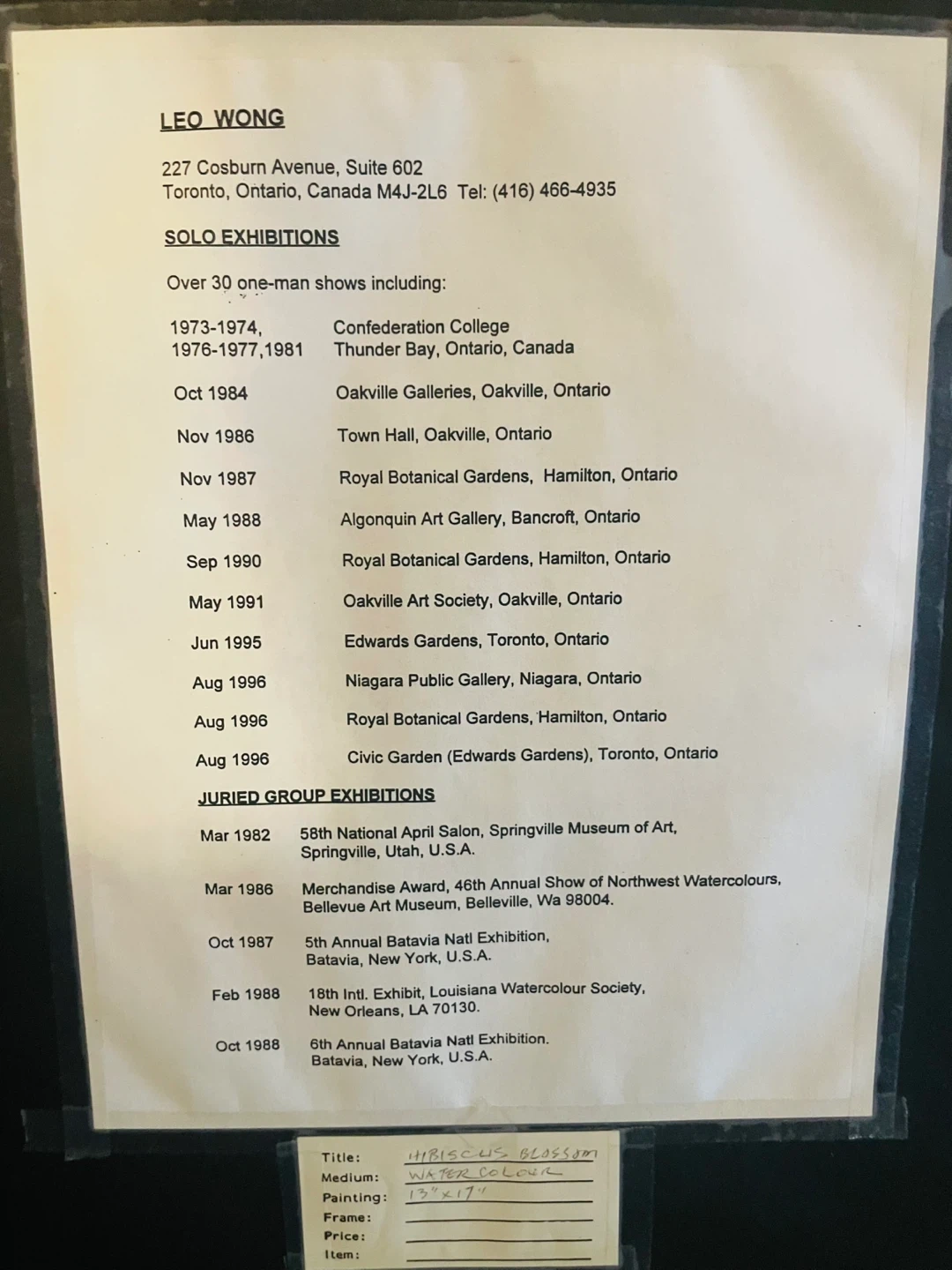 Original watercolour painting by Leo Wong titled "Hibiscus Blossom". The medium is watercolour on paper, with dimensions of 13 x 17 inches. Framed with a gold-tone border and matting.