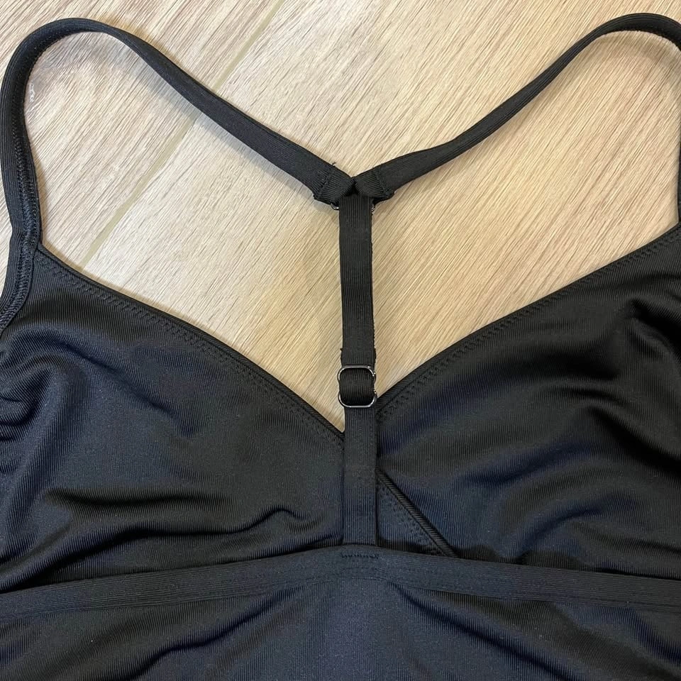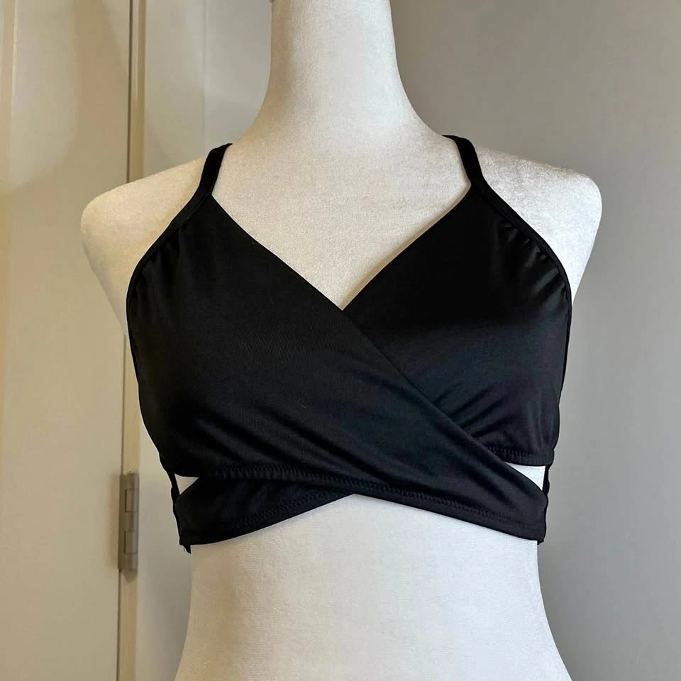 PINK by Victoria’s Secret black wrap bralette with side cutouts. Adjustable T-strap in the back. Features subtle “PINK” logos along the back band. Thick, elastic band in the back with cross over front detail. Stretch. No size tag, but fits MEDIUM.