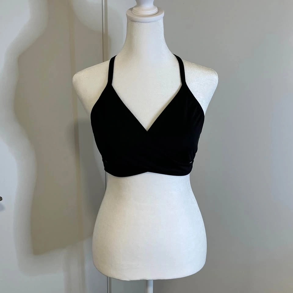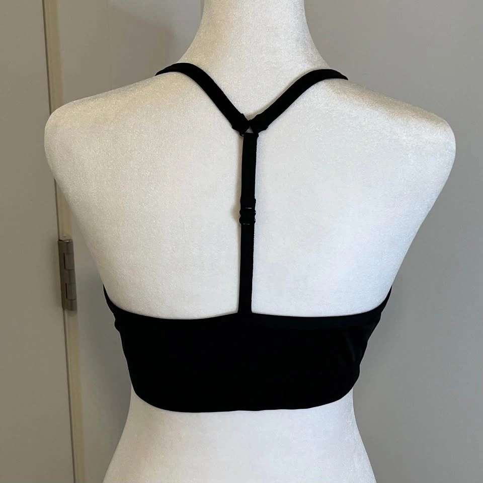 PINK by Victoria’s Secret black wrap bralette with side cutouts. Adjustable T-strap in the back. Features subtle “PINK” logos along the back band. Thick, elastic band in the back with cross over front detail. Stretch. No size tag, but fits MEDIUM.