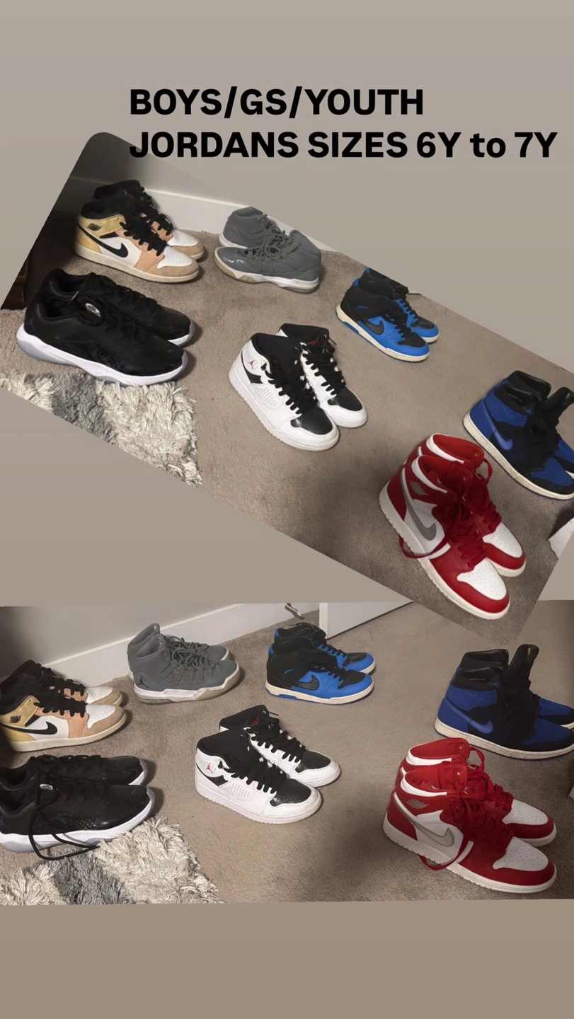Collection of Nike and Jordan Brand sneakers. Various styles and colourways. Sizes range from 6Y to 7Y. Excellent for boys or young athletes.