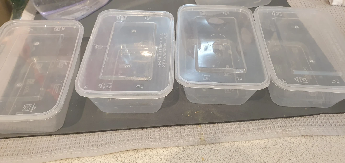 These four clear plastic containers are suitable for microwave reheating. They're freezer safe too! They're made of PP plastic. Each container is marked with '04'.