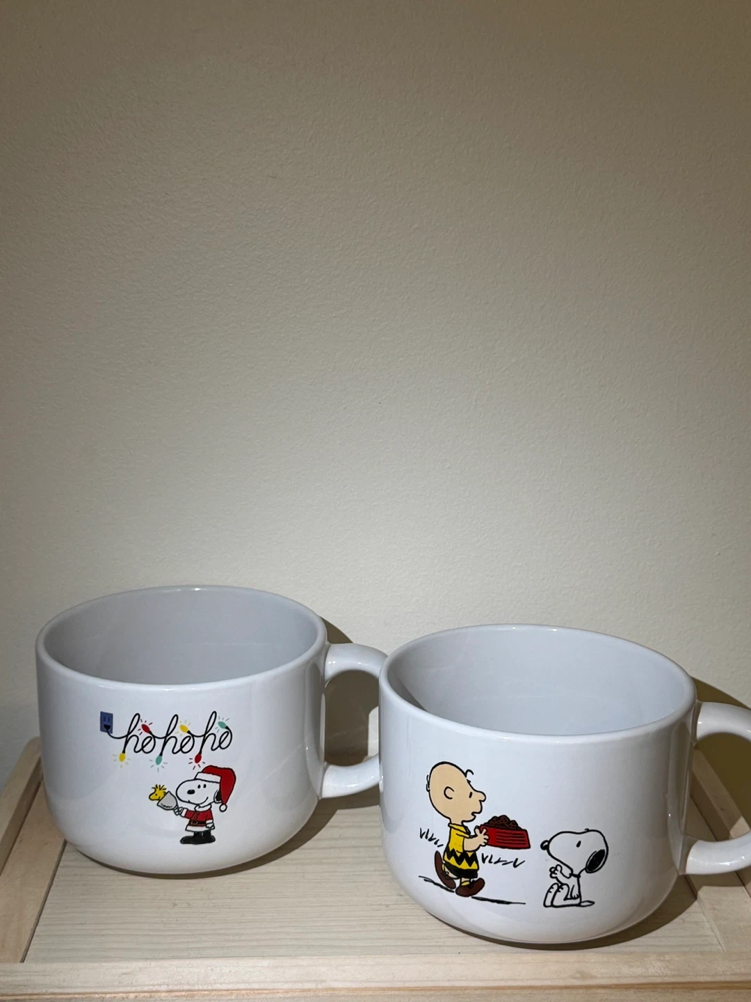 This set features two white ceramic mugs with festive Peanuts holiday designs. One mug shows Snoopy with 'hohoho' and Christmas lights, while the other has Charlie Brown sharing food with Snoopy. They're perfect for enjoying a warm drink during the holiday season!