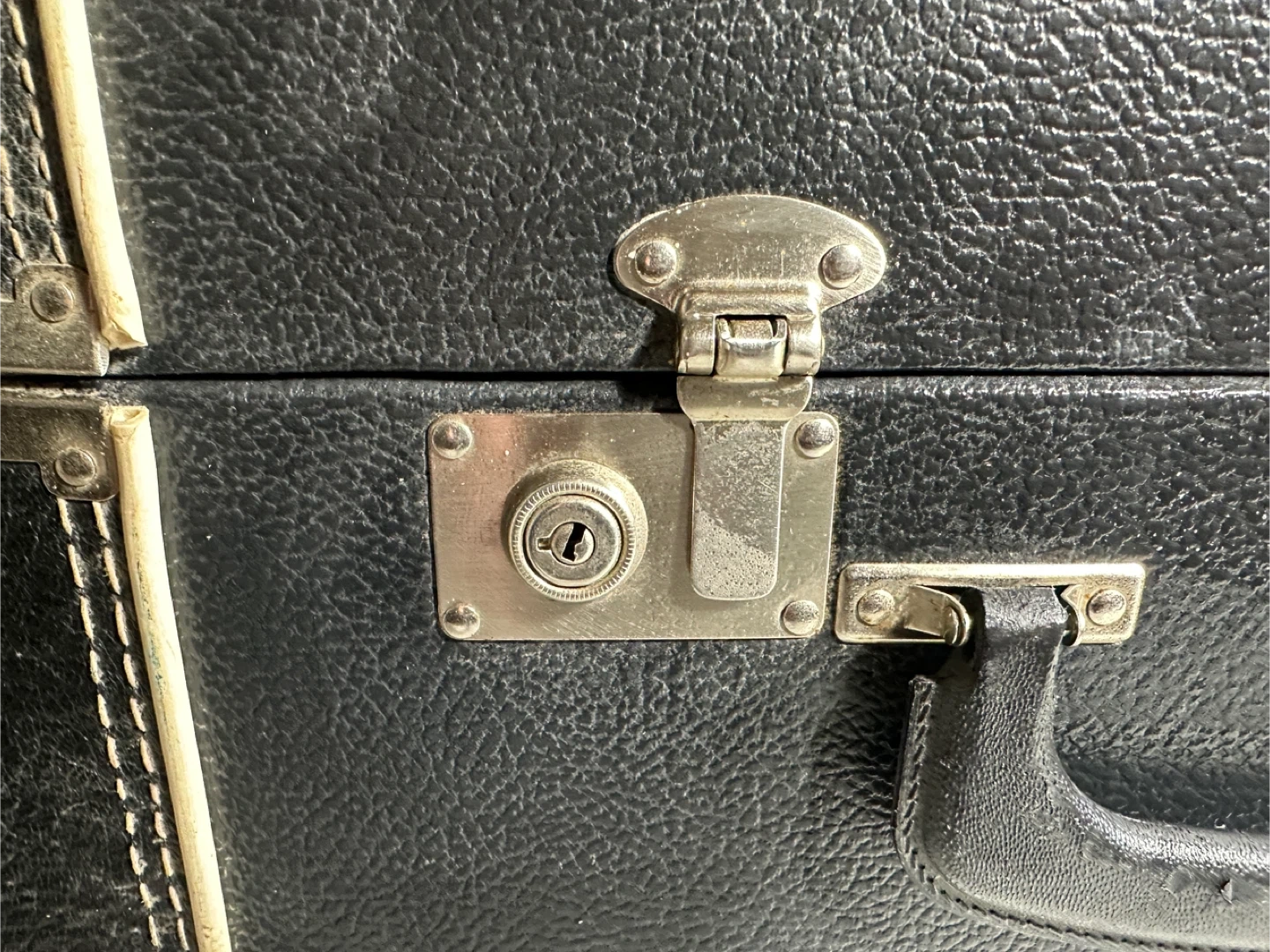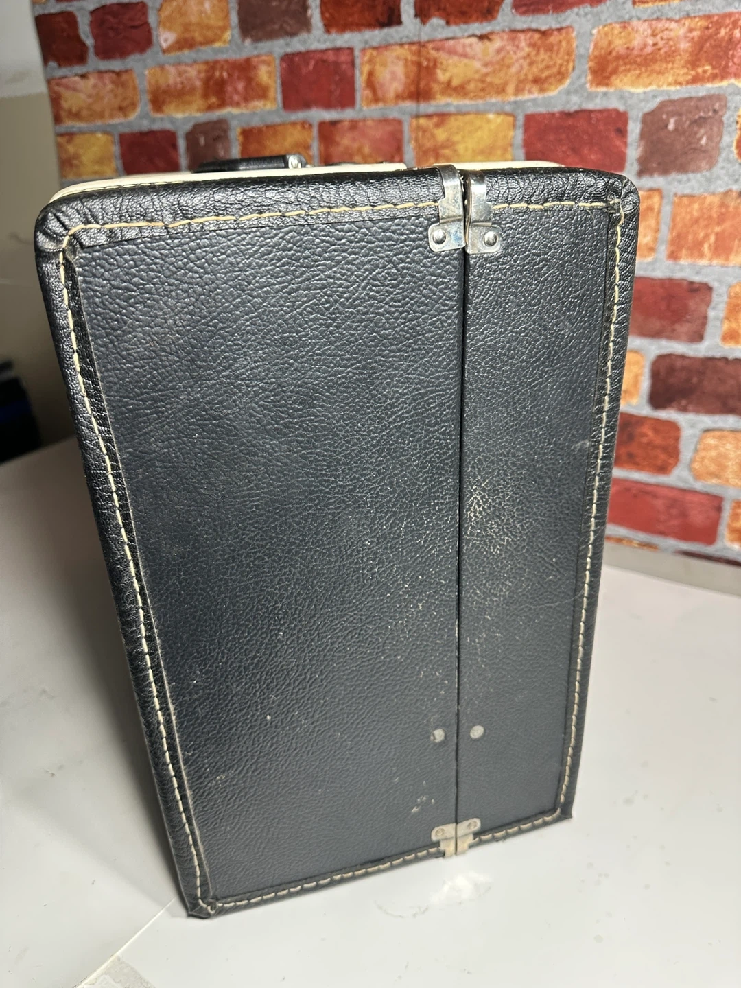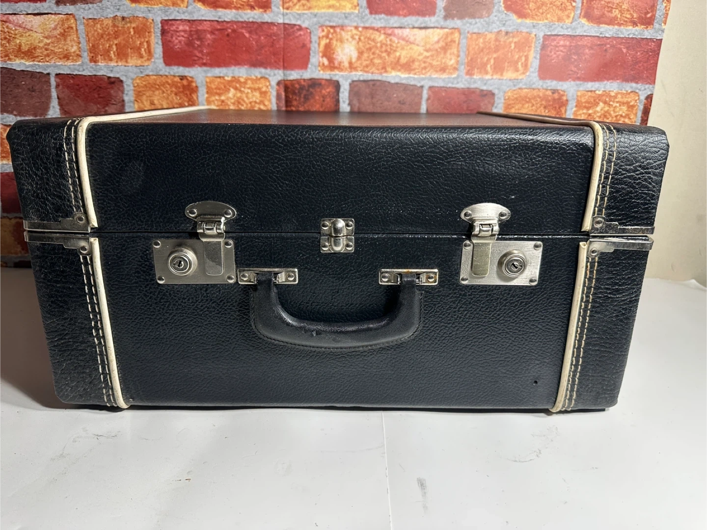 This is a vintage black suitcase with a faux leather exterior. It has two latches and a central lock. The exterior stitching is white. It measures approximately 17 inches wide, 11 inches high, and 6 inches deep.