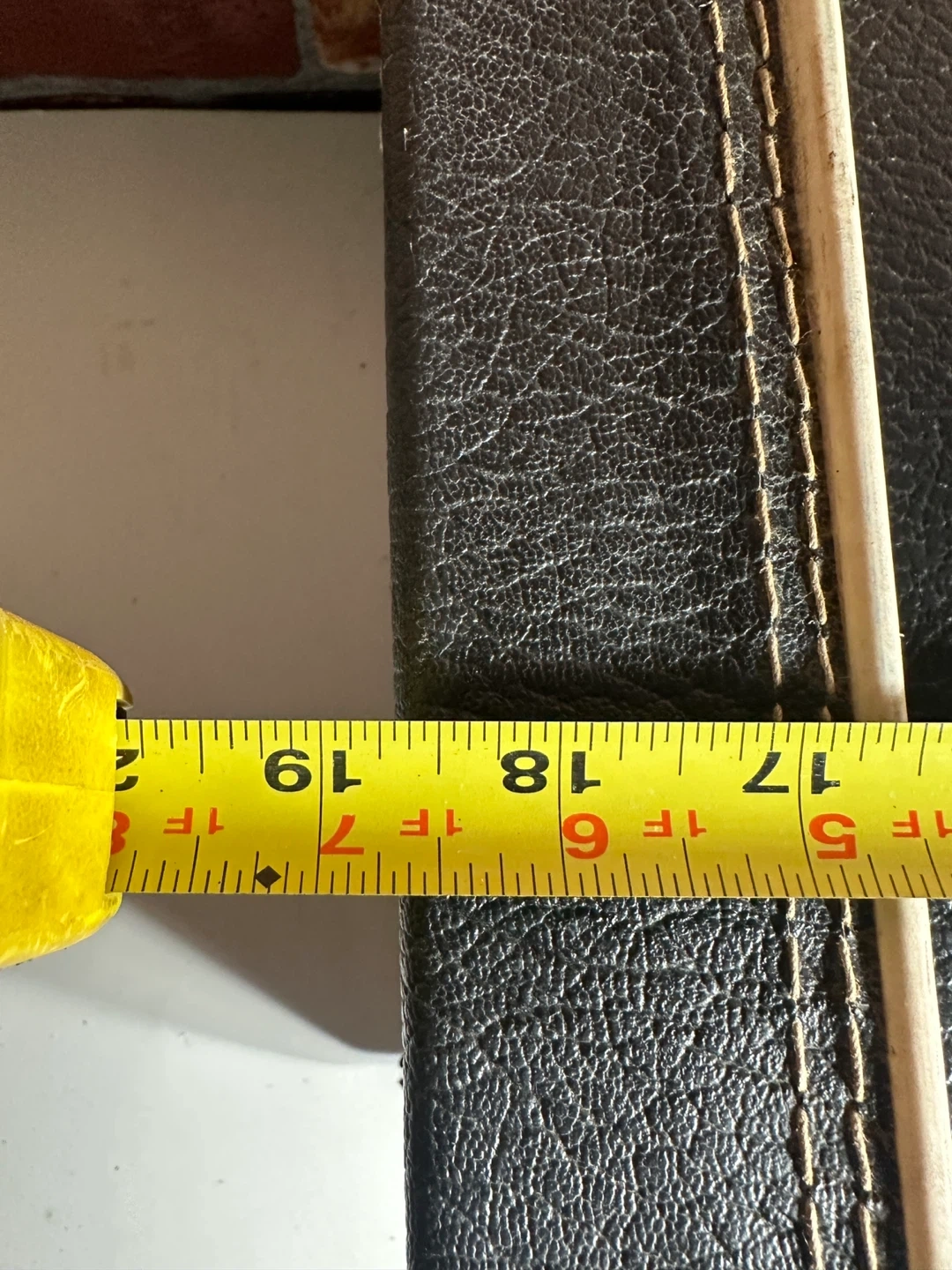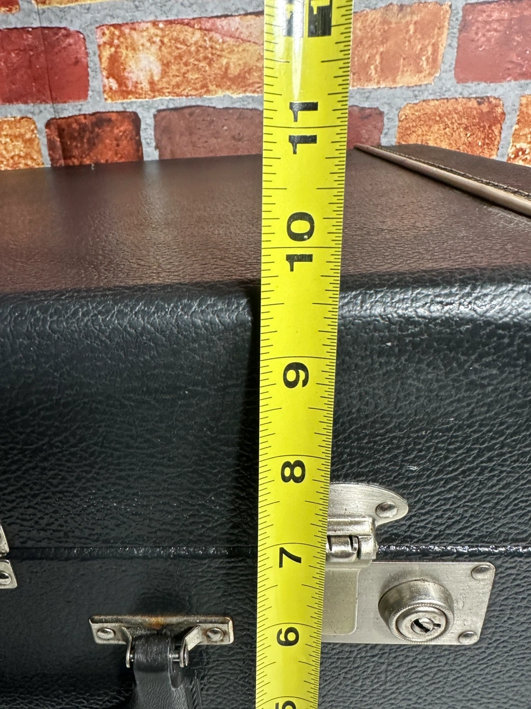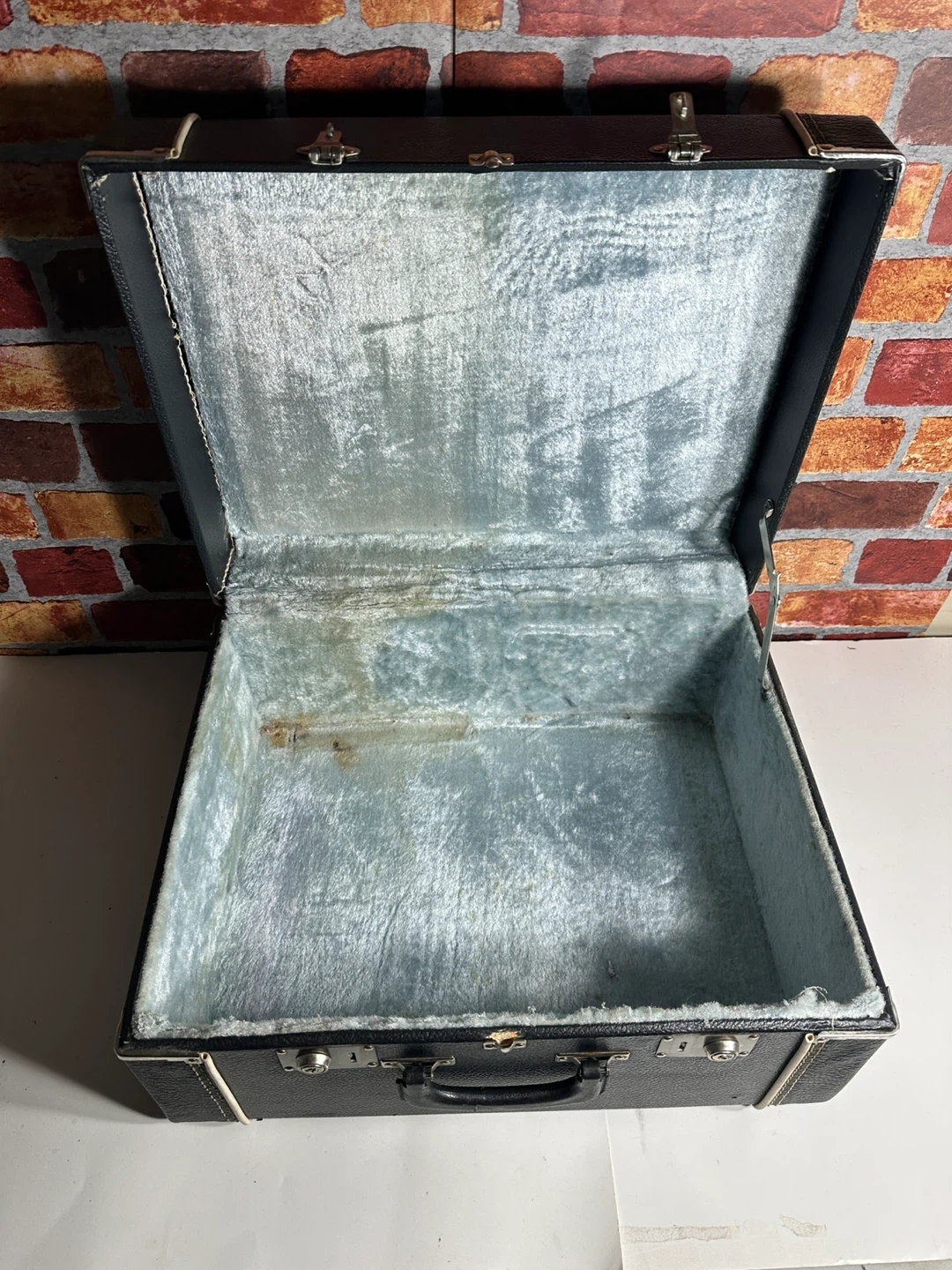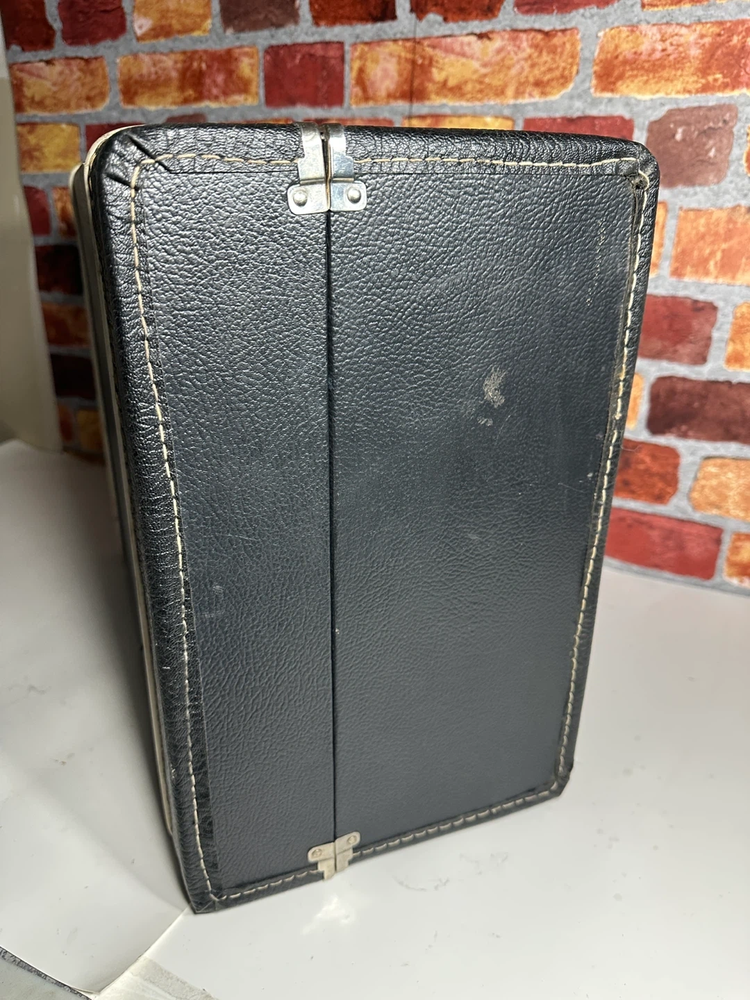 This is a vintage black suitcase with a faux leather exterior. It has two latches and a central lock. The exterior stitching is white. It measures approximately 17 inches wide, 11 inches high, and 6 inches deep.