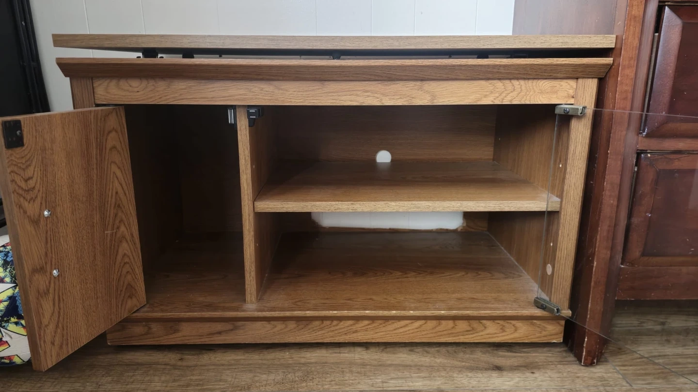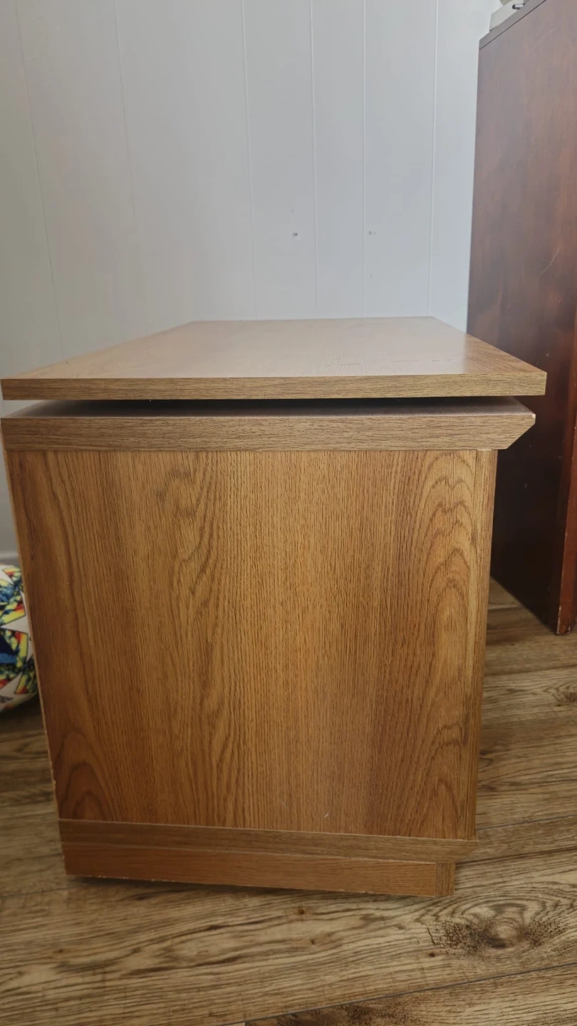 Here's a sturdy oak wood side table that's perfect for extra storage! It has a nice, natural finish and would look great in a living room, bedroom, or even an entryway. It features a shelf and a cabinet for storing items