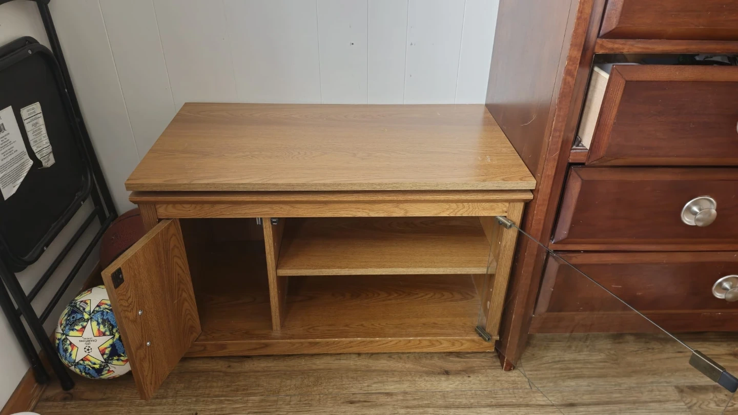 Here's a sturdy oak wood side table that's perfect for extra storage! It has a nice, natural finish and would look great in a living room, bedroom, or even an entryway. It features a shelf and a cabinet for storing items