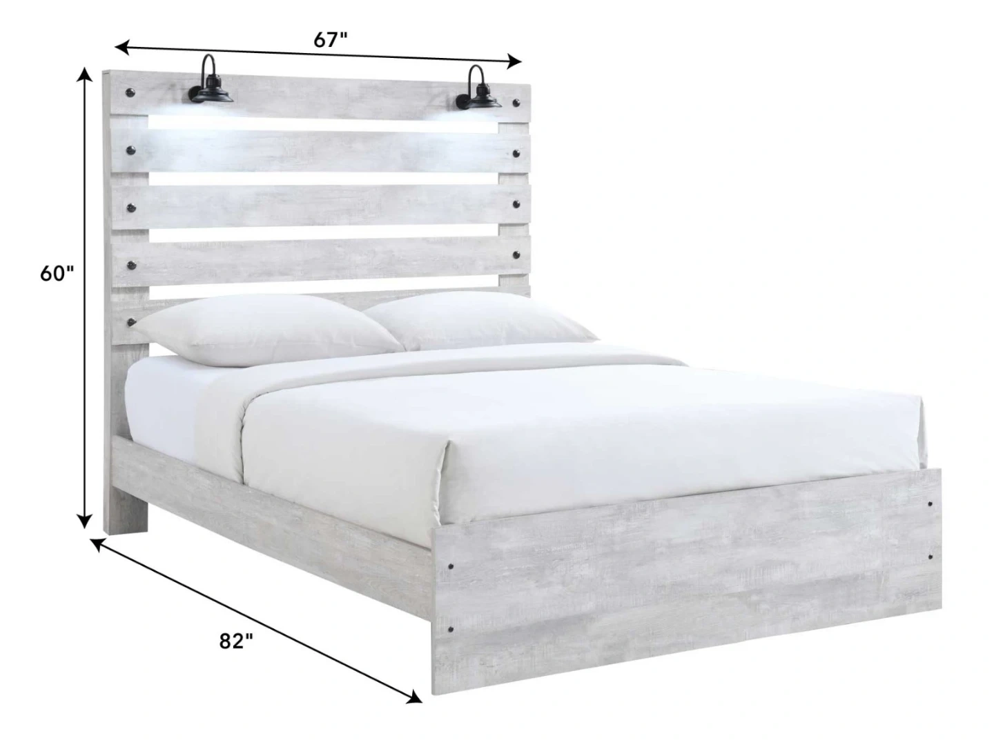 This bed frame measures 82" long by 67" wide. The headboard is 60" tall and includes two built-in lights. It's a stylish and functional addition to any bedroom!
