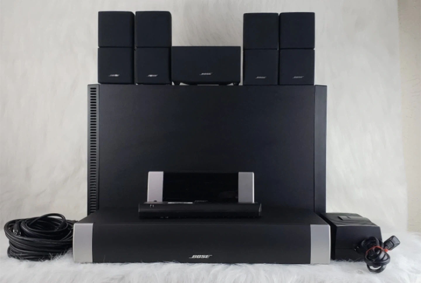 Moving sale! Complete Bose 5.1 channel home theatre speaker system featuring a media console, Acoustimass bass module subwoofer, and Direct/Reflecting 5 cube speakers set. It supports 1080p upscaling via HDMI, includes ADAPTiQ audio calibration for room-specific sound, and features Videostage 5 decoding. Paid $2000 originally.