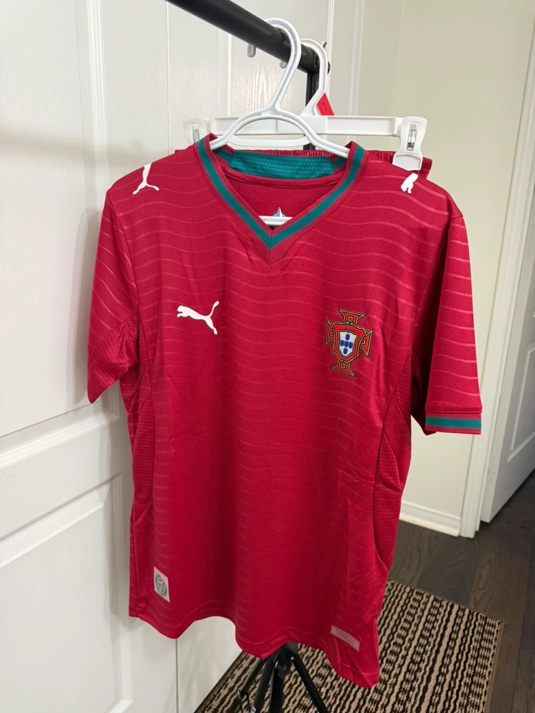 Red soccer jersey with Portugal crest. Features short sleeves and a V-neck collar. Made with breathable fabric.come with short.age 5 to 13