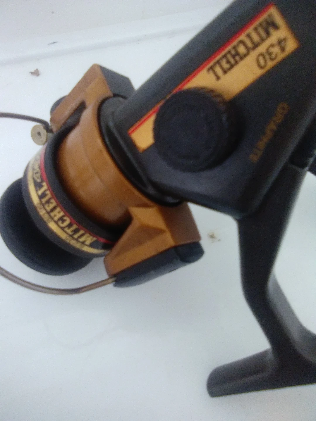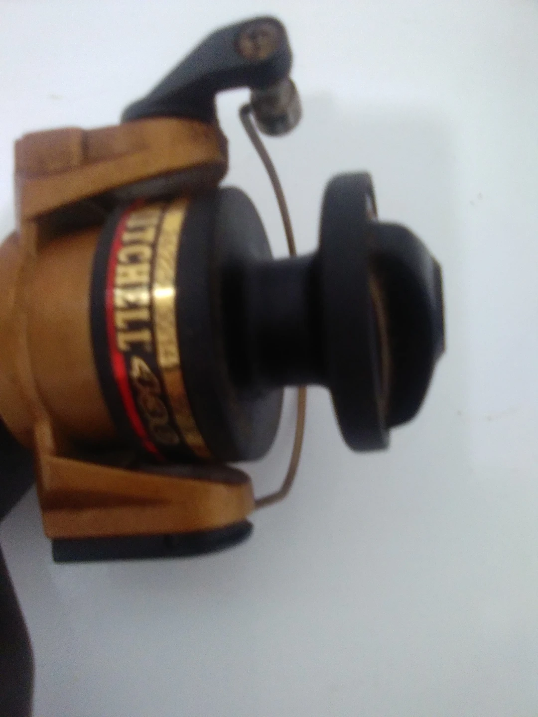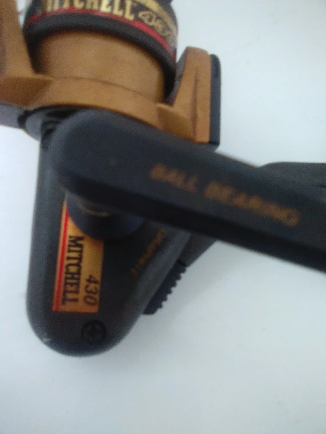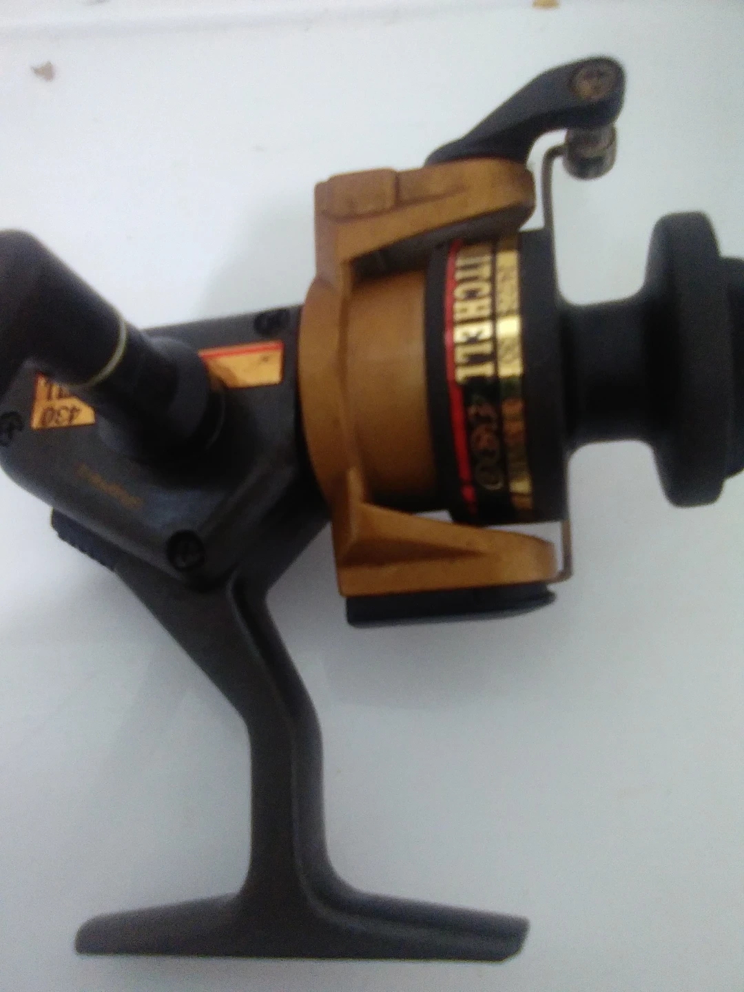 This is a Mitchell 430 spinning fishing reel. It features ball bearing operation. The reel is made of durable graphite material.
