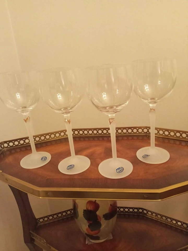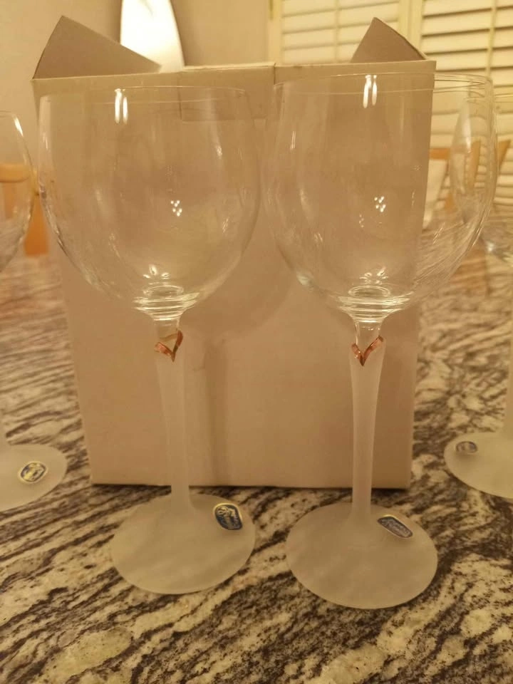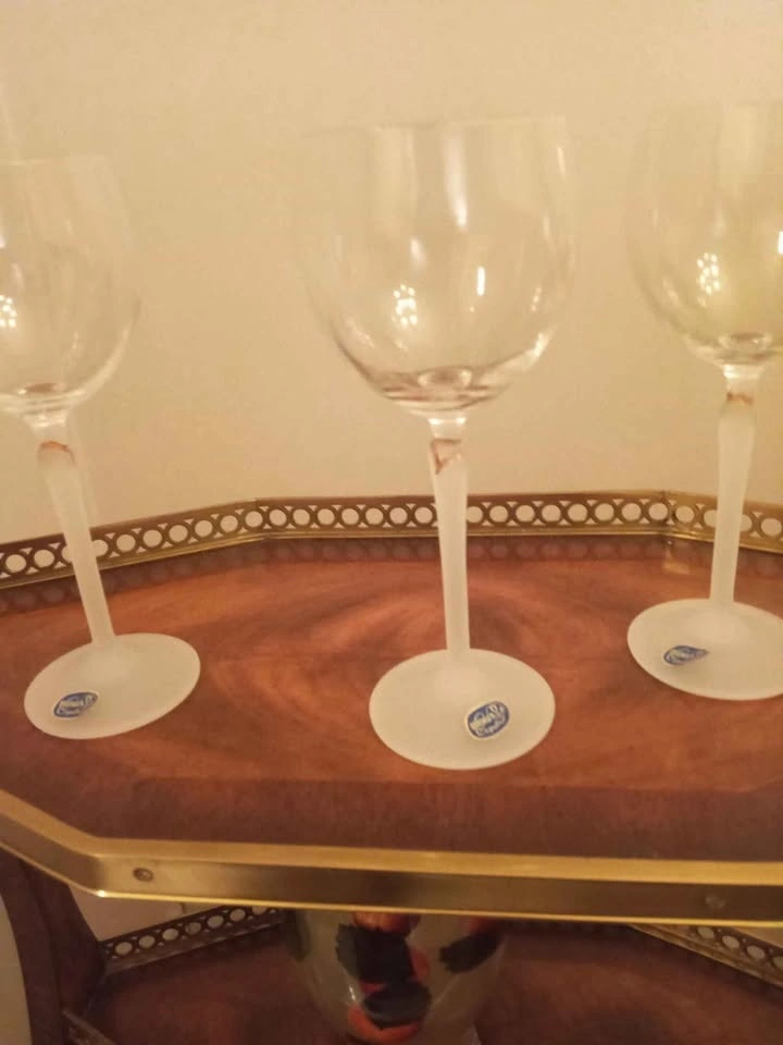 Bohemia Crystal from "Crystalex Line". These 7" tall flutes feature frosted stems with gold tone accents. 8 pieces available.