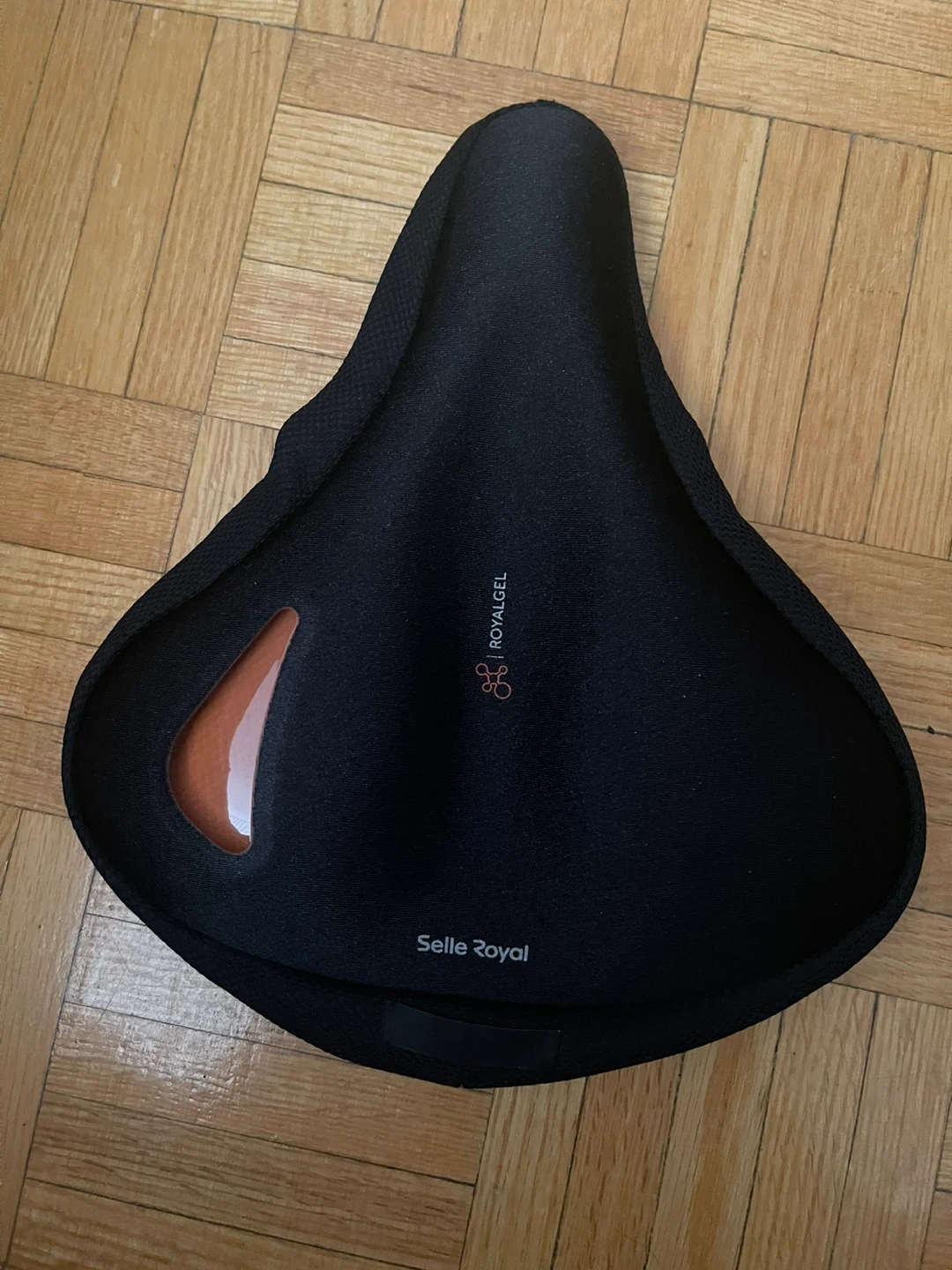 This is a Selle Royal bicycle seat cover with Royalgel padding. It features a non-slip bottom and an adjustable drawstring for a secure fit. Its design helps provide added comfort on rides.