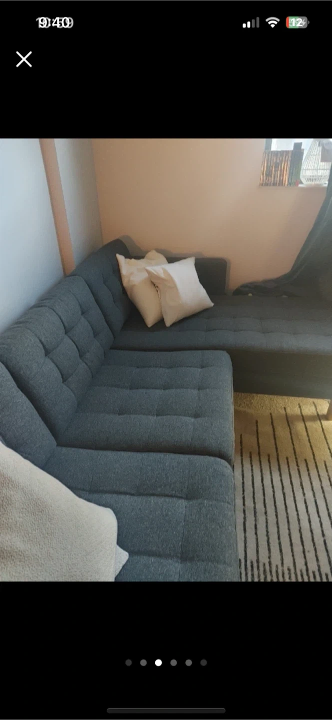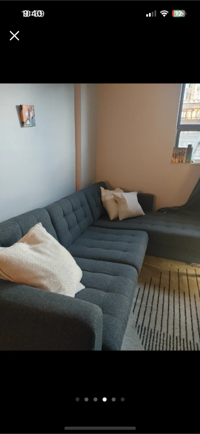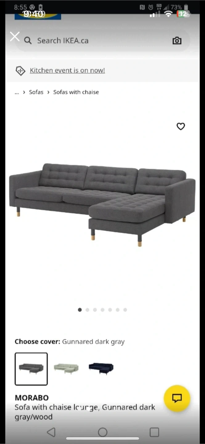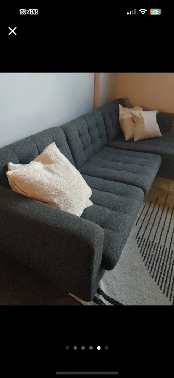 Selling an IKEA Morabo grey sectional sofa. It's a comfortable and cozy sectional with a tufted back and wooden legs. Includes a chaise lounge.