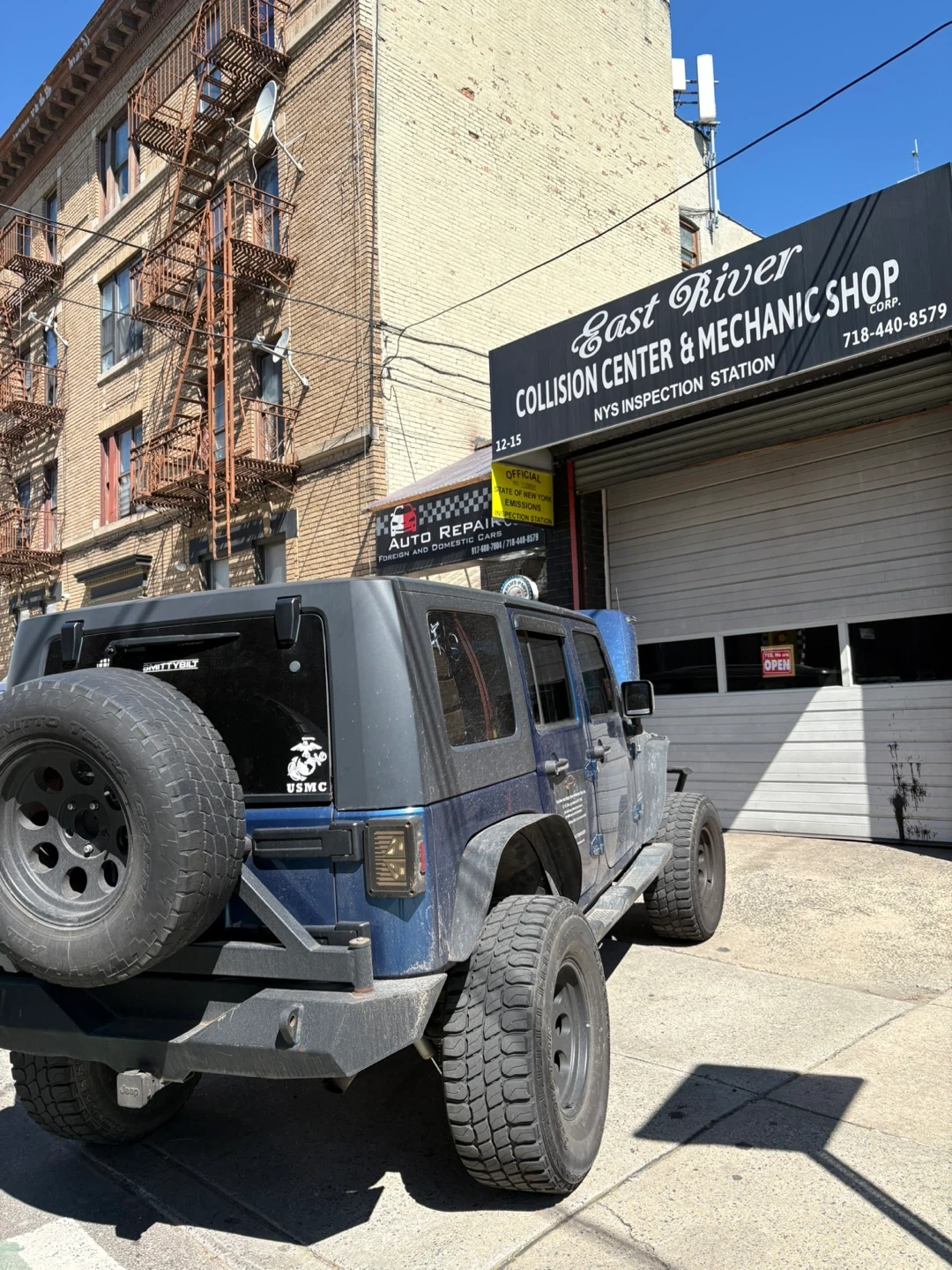 Blue Jeep Wrangler, 4-door model. It has aggressive off-road tires and a lifted suspension. The hood is open, showing the engine. Includes a spare tire on the back.