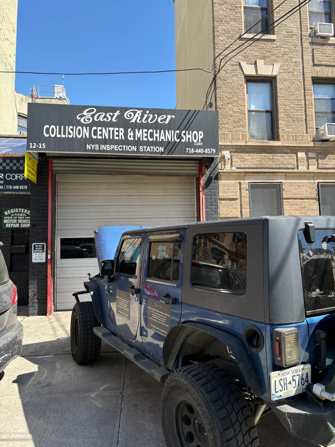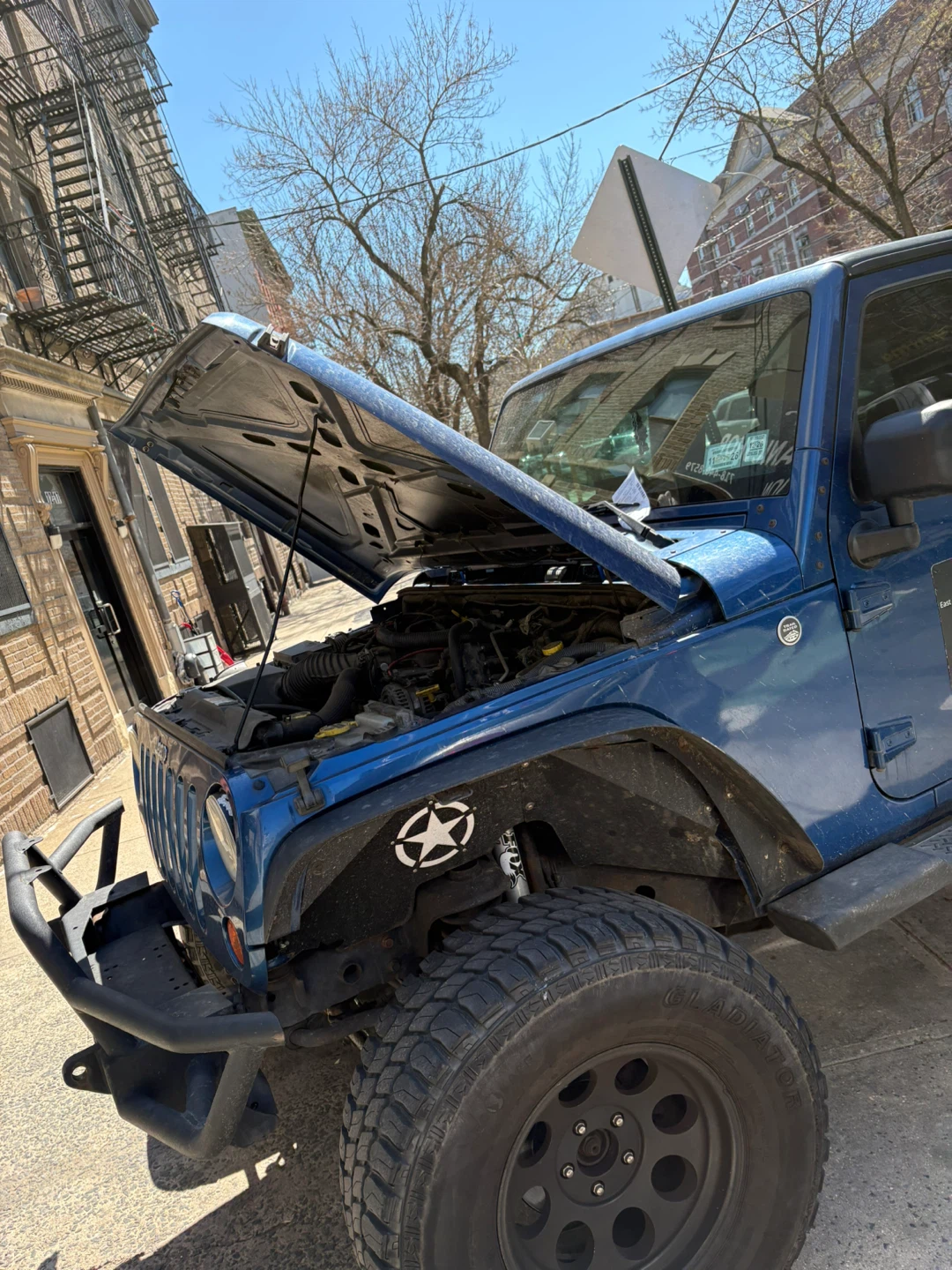 Blue Jeep Wrangler, 4-door model. It has aggressive off-road tires and a lifted suspension. The hood is open, showing the engine. Includes a spare tire on the back.