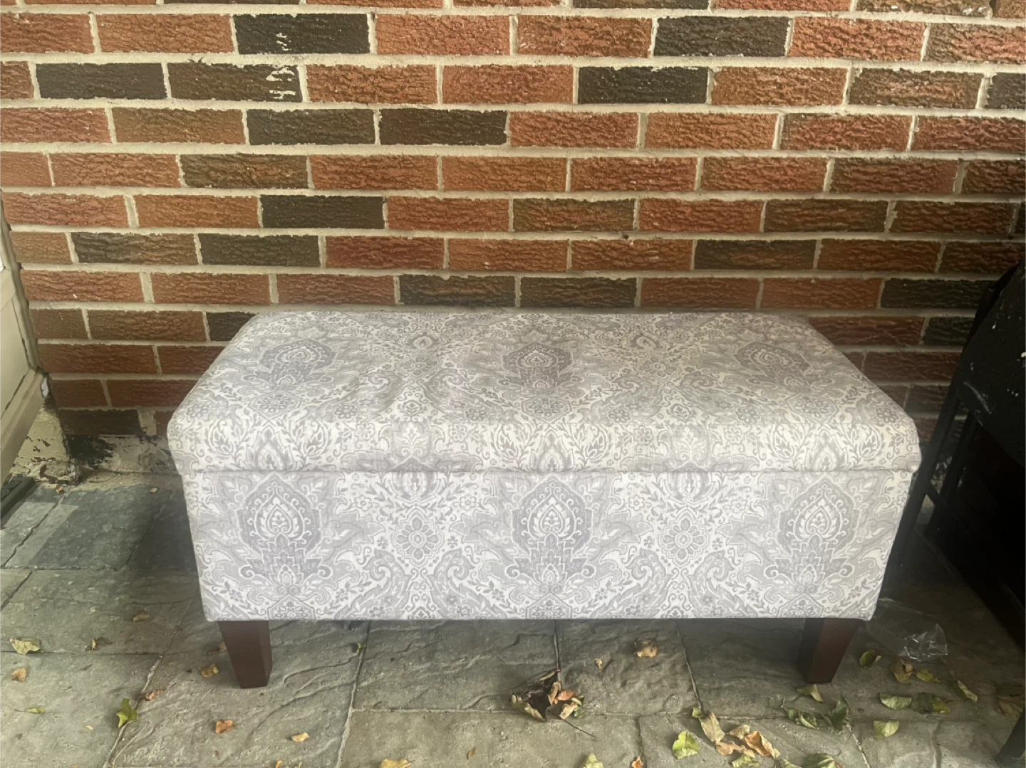 Here's a lovely ottoman storage bench. It features a pretty patterned design in light gray and white. Perfect for adding extra seating and storage to any room!