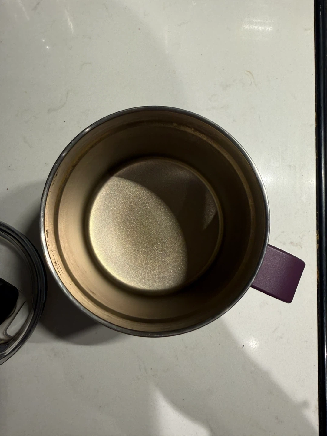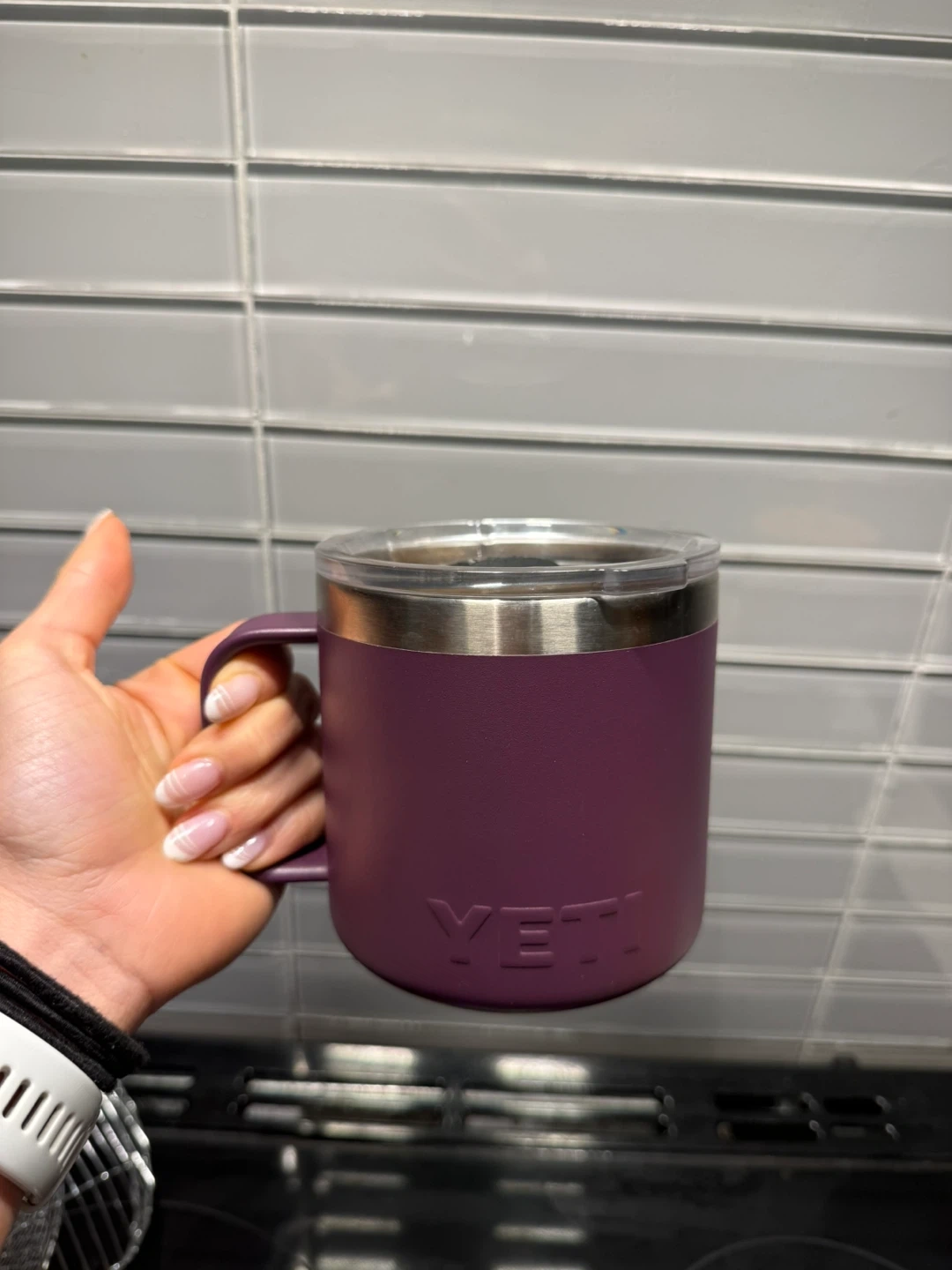 Yeti Rambler mug in purple with a lid. Stainless steel construction. It's great for keeping drinks hot or cold.