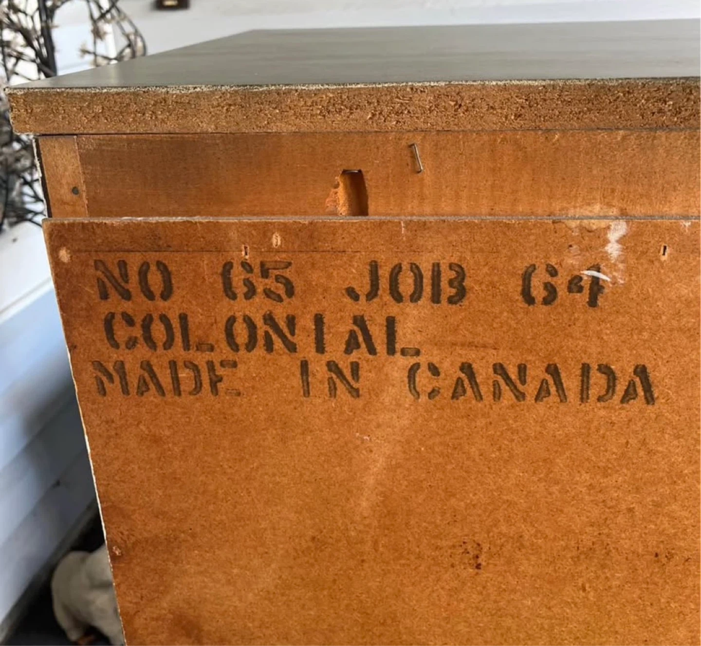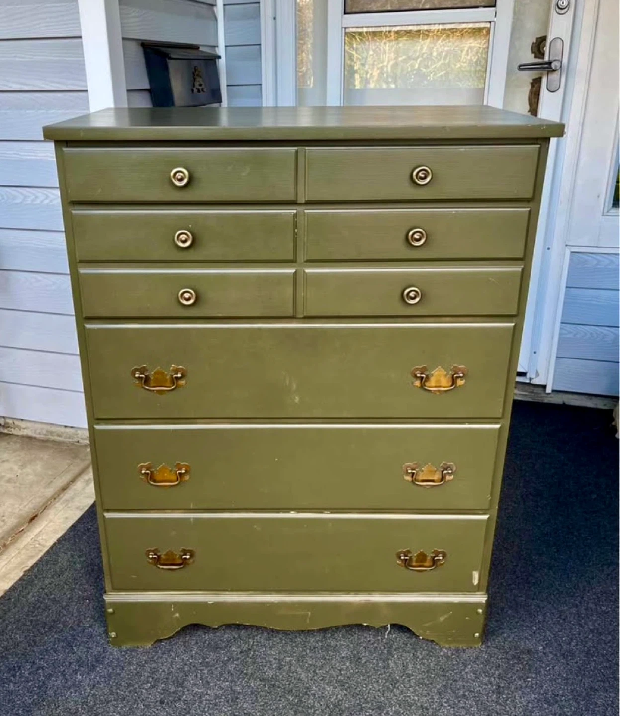 The exterior is painted green and it features brass-coloured drawer pulls. It's made in Canada.