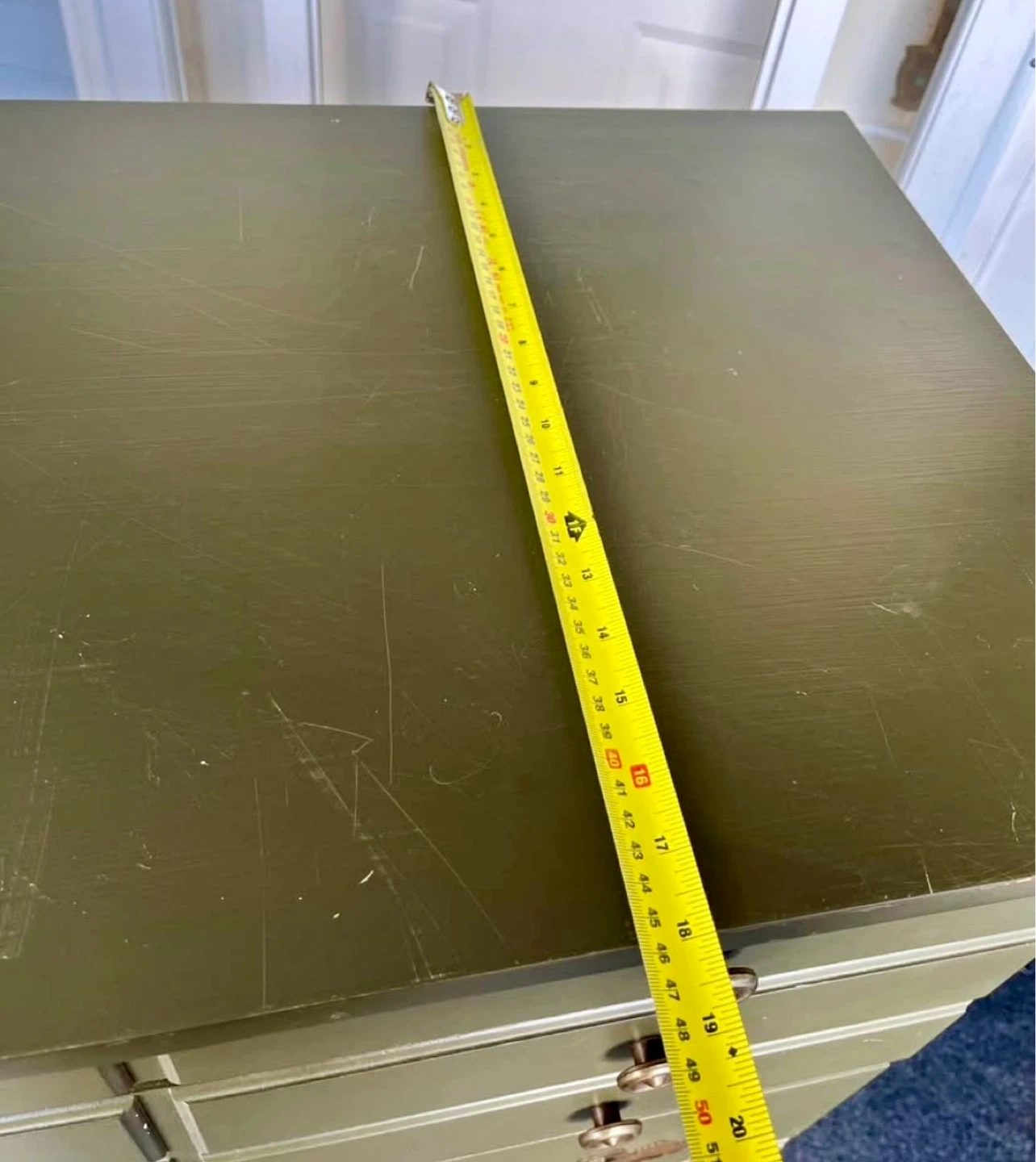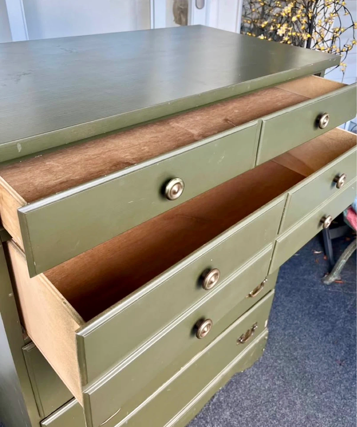 This green dresser has 5 drawers for ample storage.