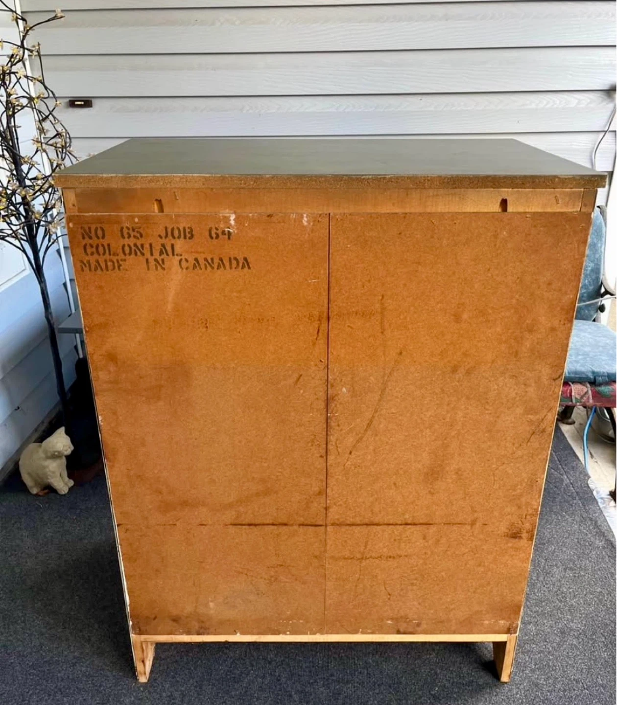 The exterior is painted green and it features brass-coloured drawer pulls. It's made in Canada.