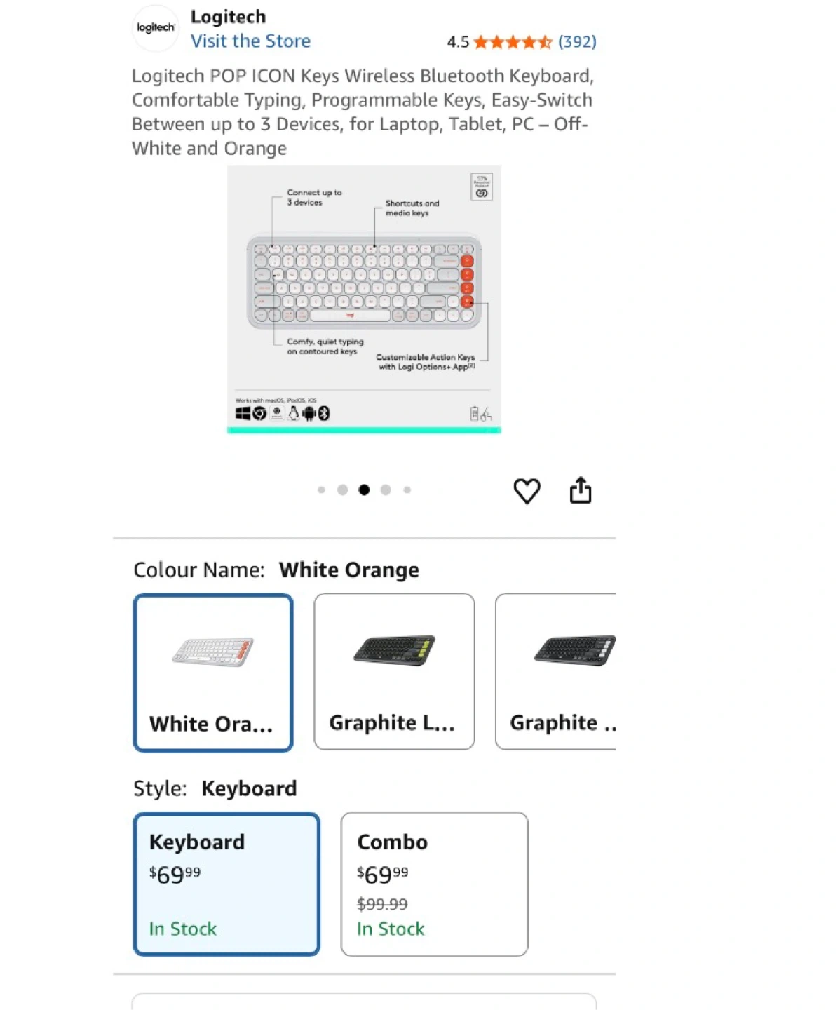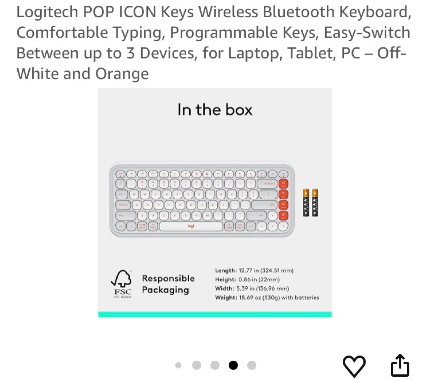 This is a Logitech POP KEYS ICON wireless Bluetooth keyboard in off-white and orange. It supports easy switching between up to 3 devices. Includes 2 AA batteries and is made with responsible packaging.