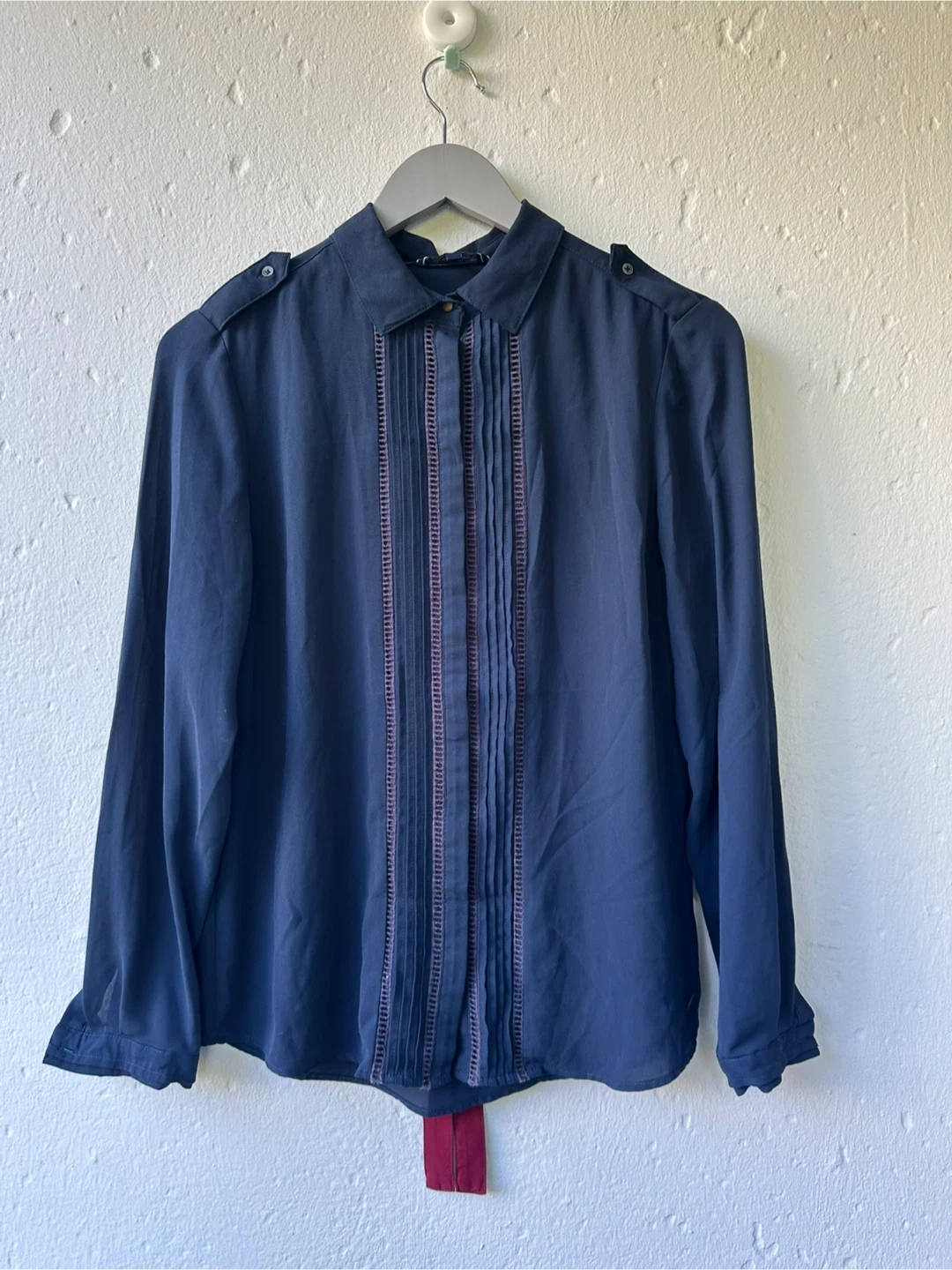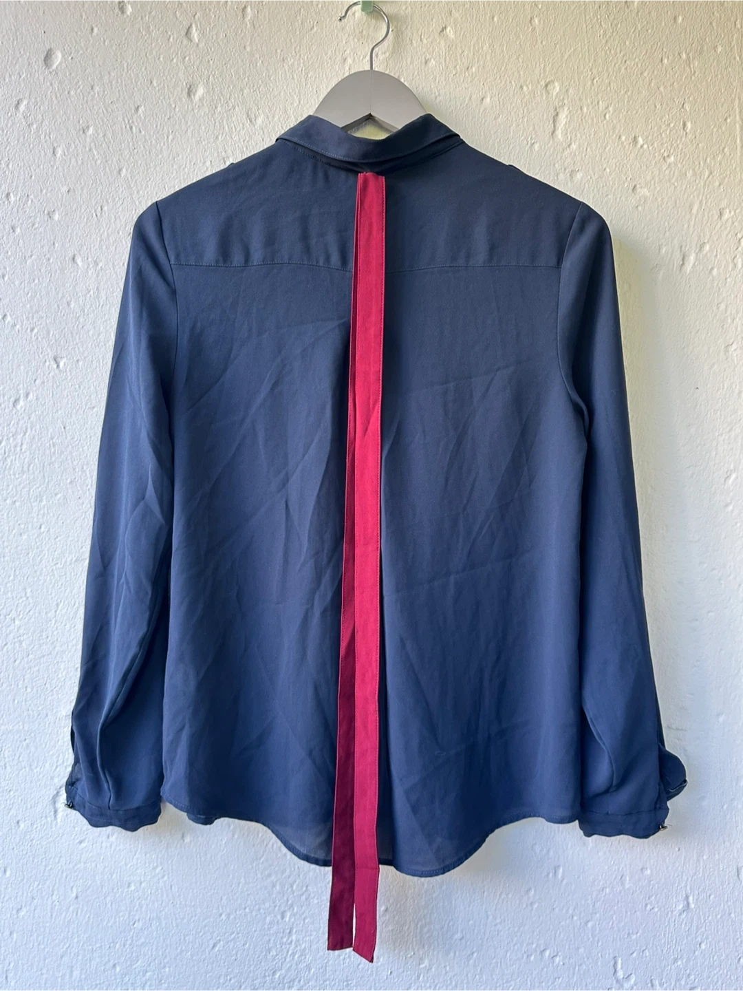 Tommy Hilfiger navy blue button-up shirt. Size is 6. Features decorative pleating on the front and a contrasting red ribbon detail down the back.