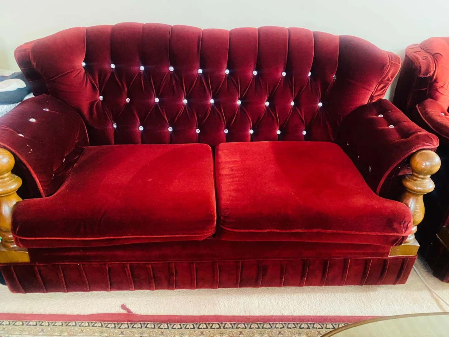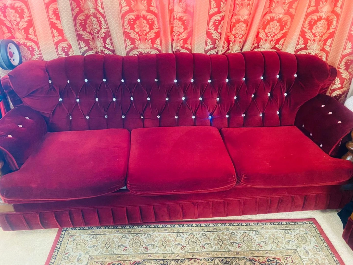 Moving sale..This is a set of three burgundy velvet sofas with diamond tufting and wooden accents. It includes a three-seater, a two-seater, and a single-seater couch. These couches are suitable for living rooms or reception areas.