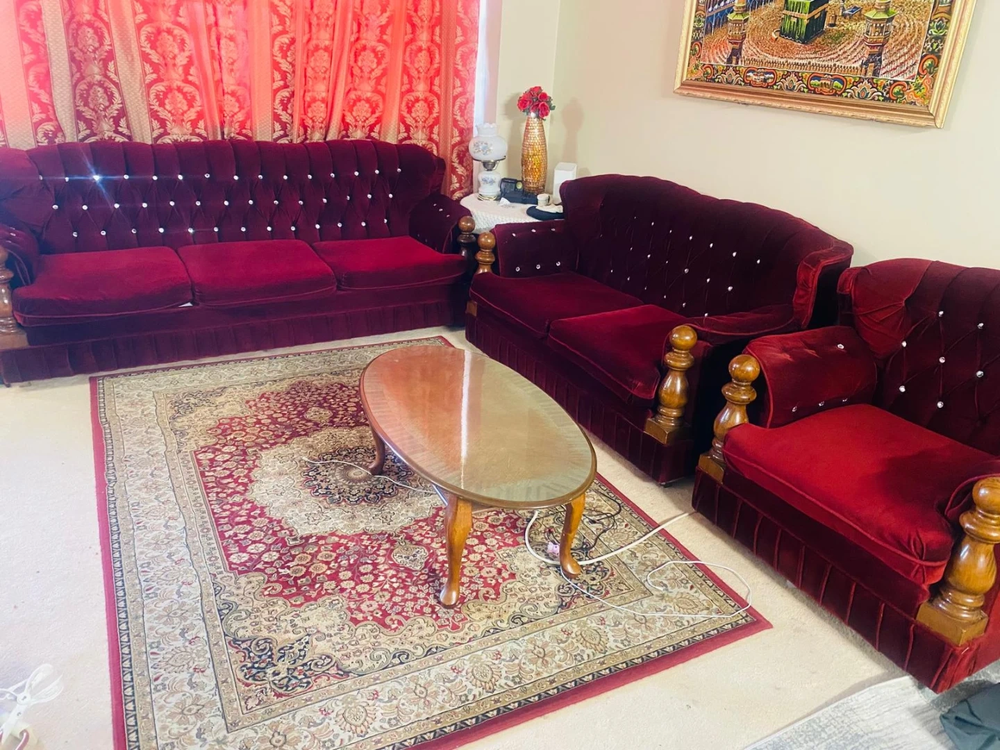 Moving sale..This is a set of three burgundy velvet sofas with diamond tufting and wooden accents. It includes a three-seater, a two-seater, and a single-seater couch. These couches are suitable for living rooms or reception areas.