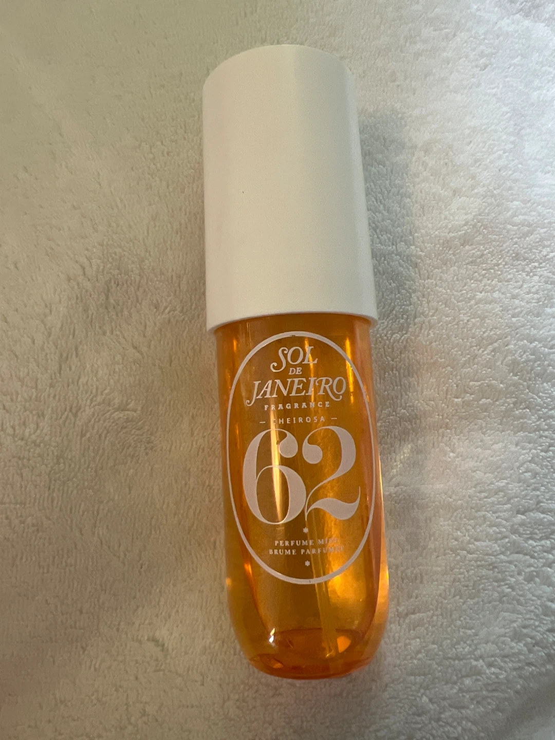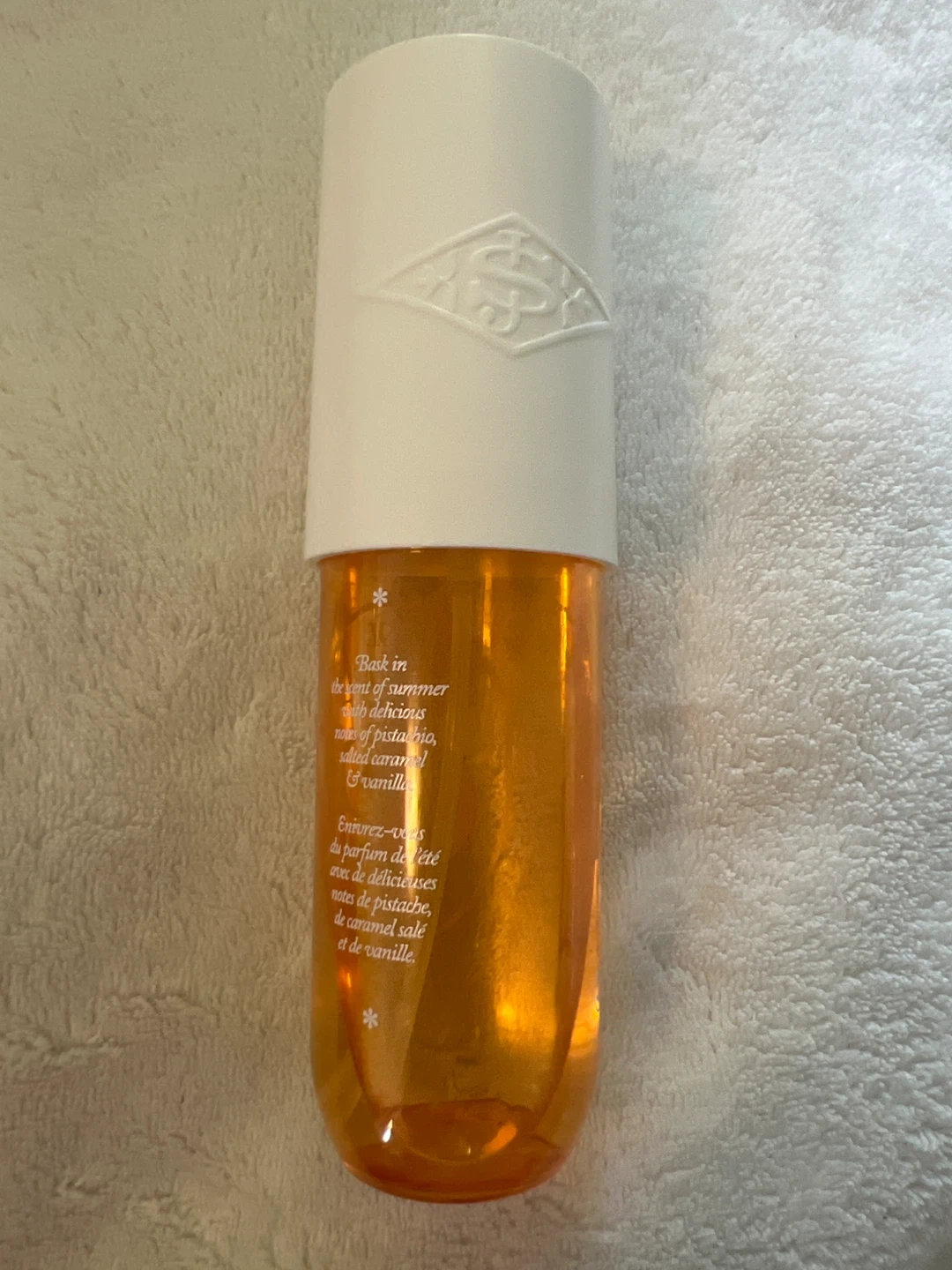 This is the Sol de Janeiro Cheirosa 62 Eau de Parfum mist. It has a delicious scent with notes of pistachio, salted caramel, and vanilla. The mist is perfect for a refreshing spritz throughout the day!