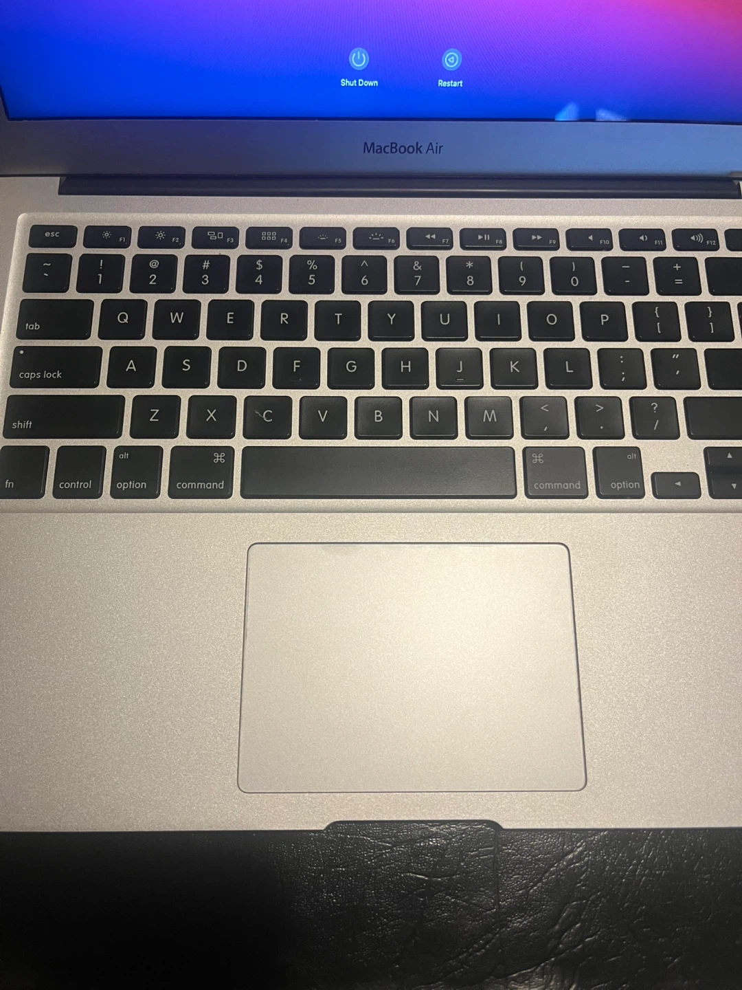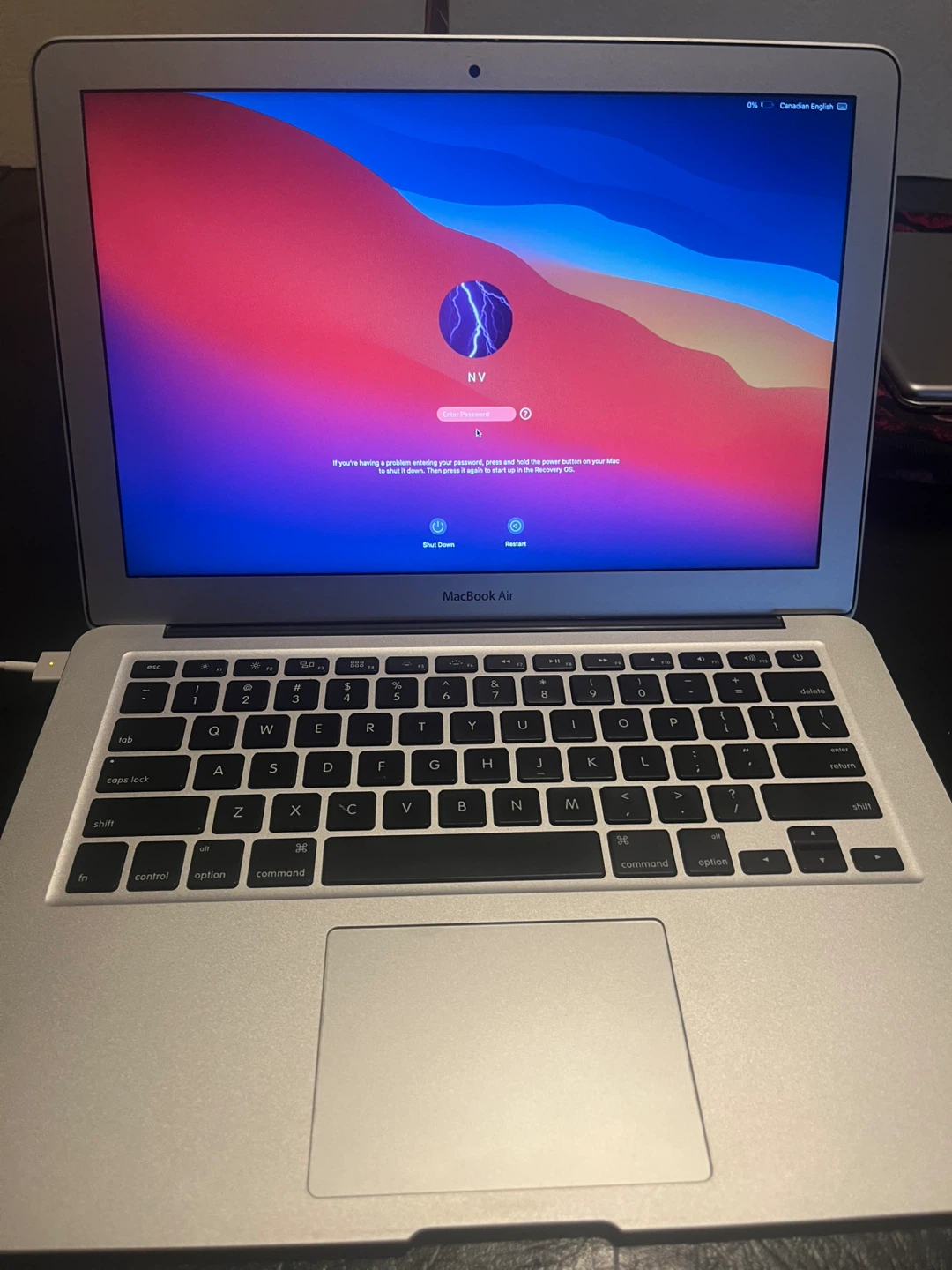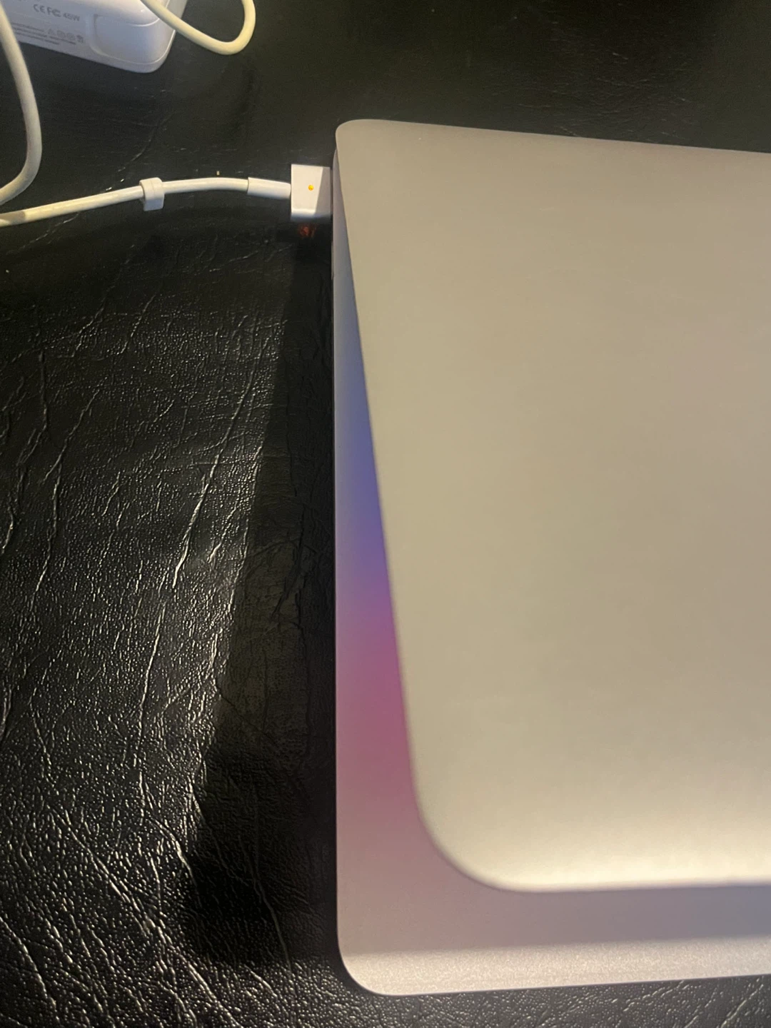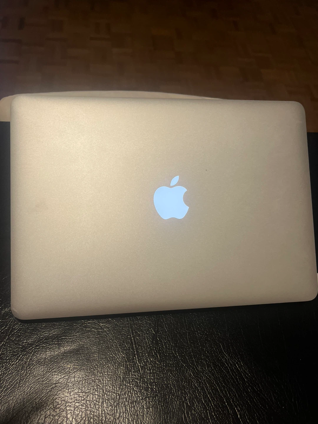 Silver Apple MacBook Air laptop. It runs macOS and features a backlit Apple logo on the lid. Includes the original charger.