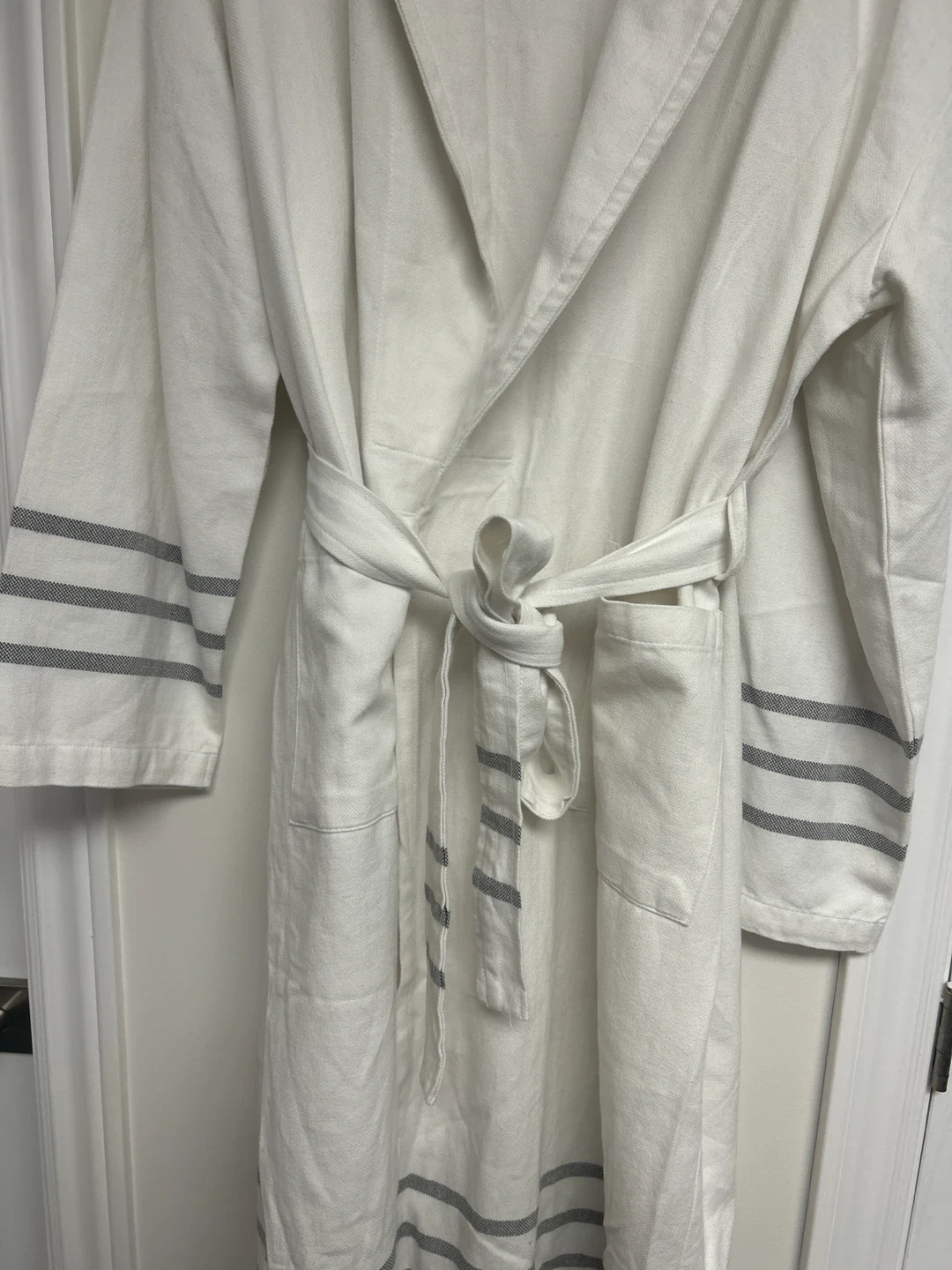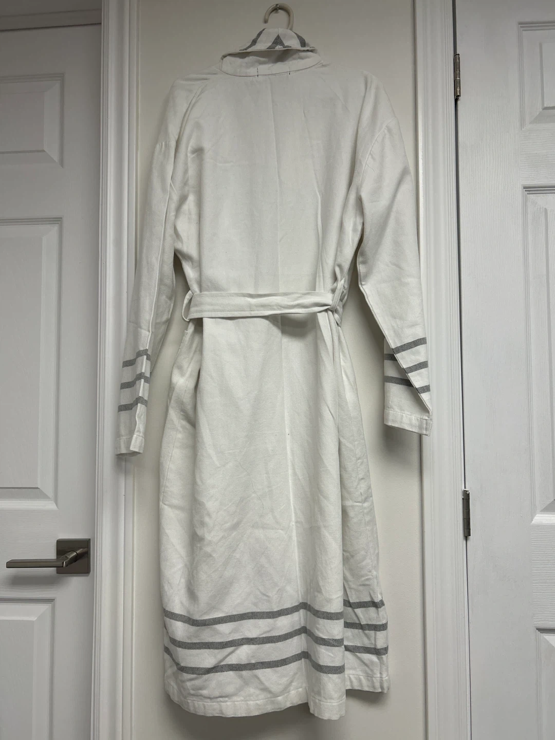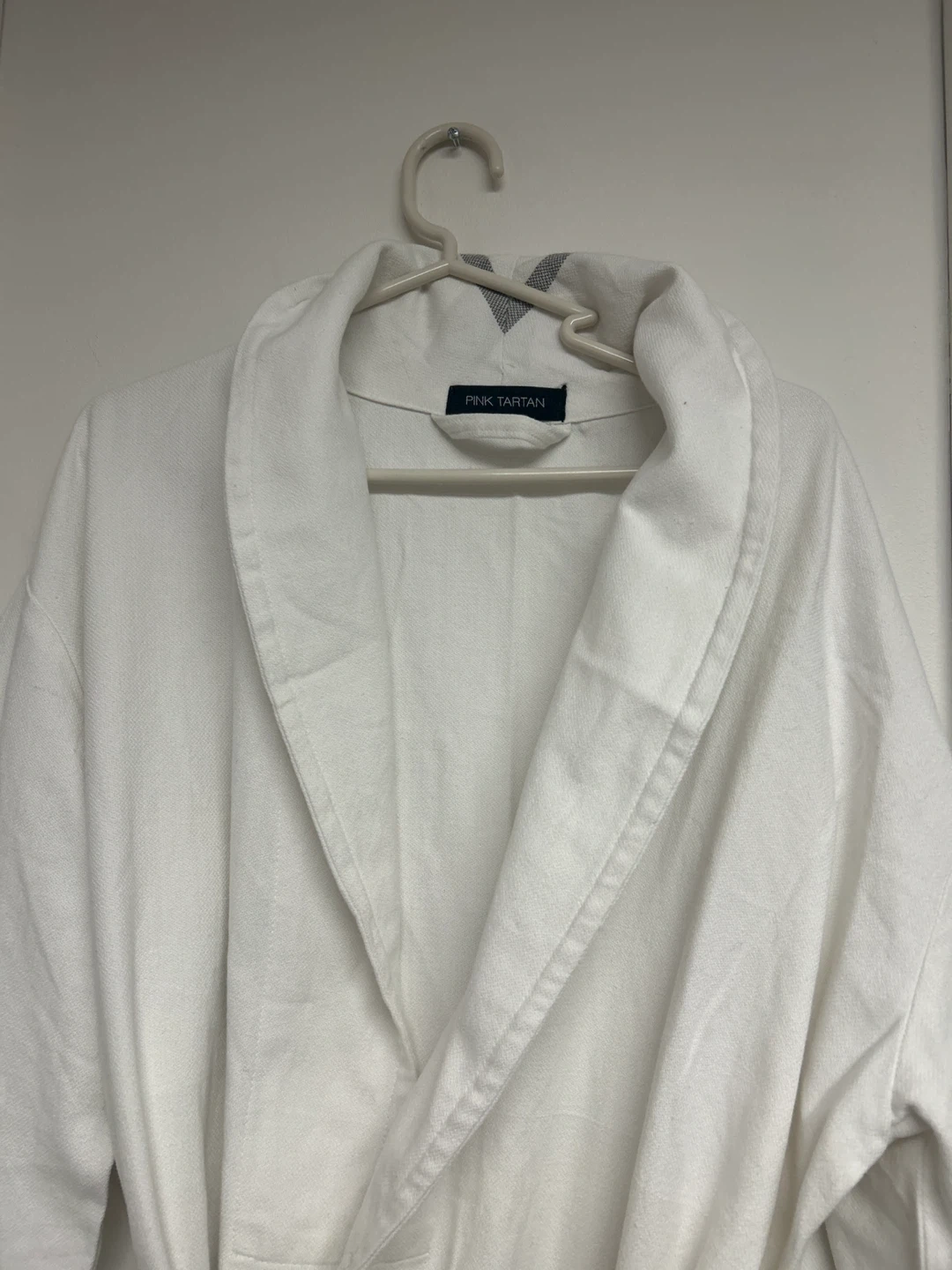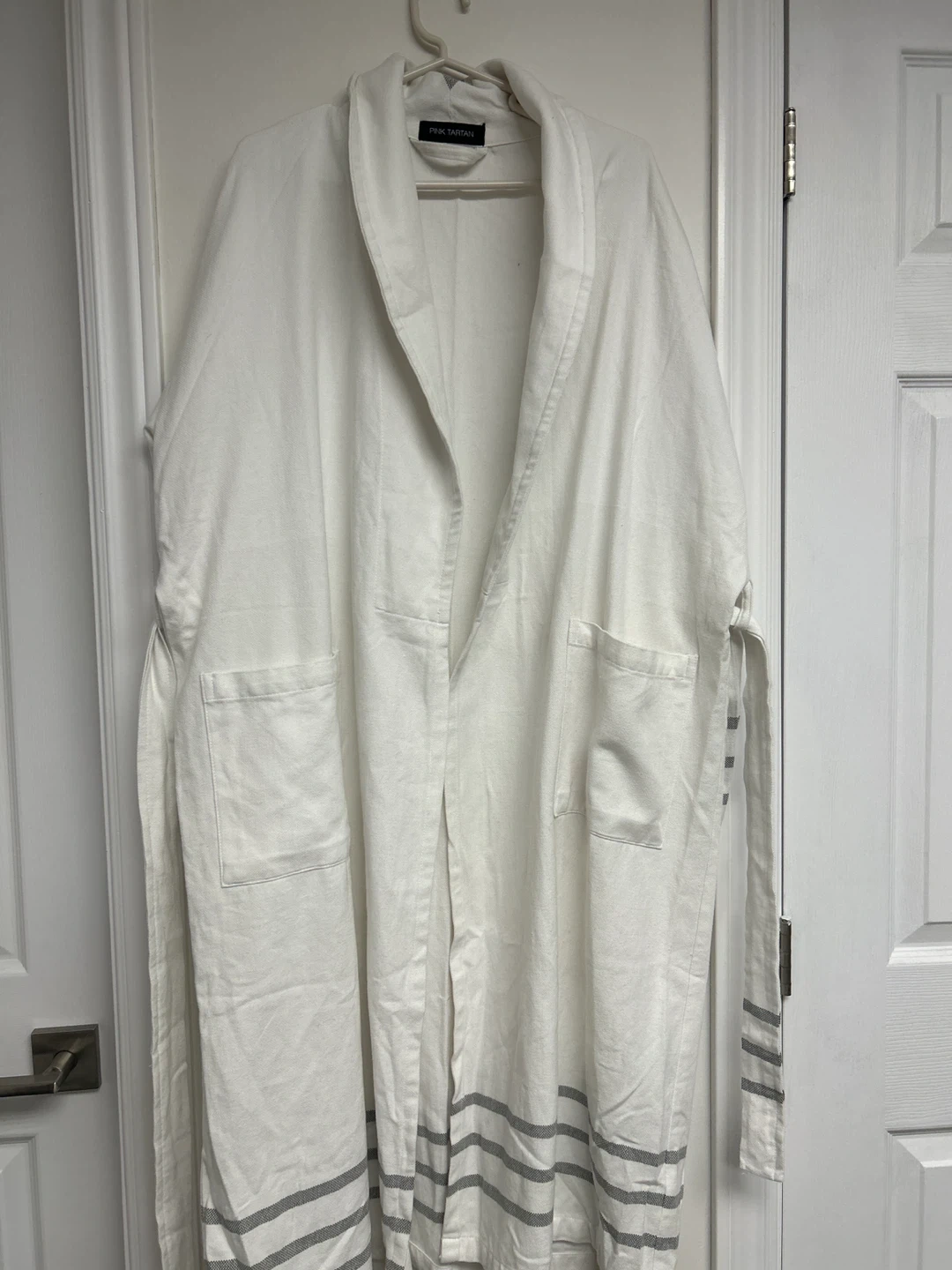 This white Pink Tartan robe features grey striped cuffs and hem. It includes a tie belt and pockets. Approximate length is 45 inches.