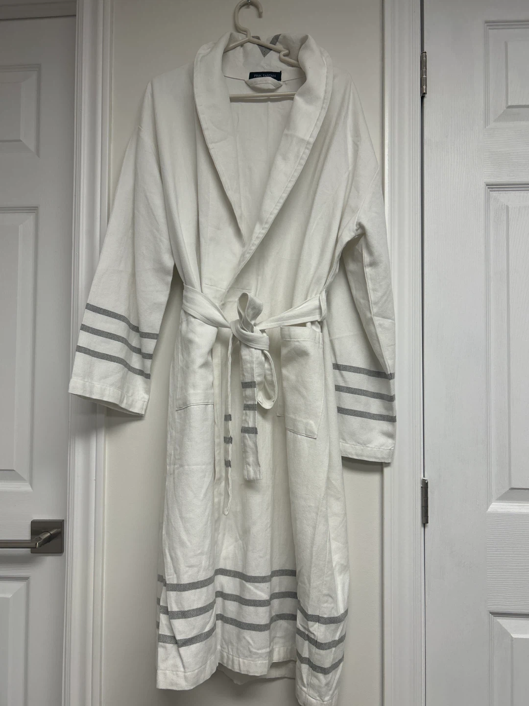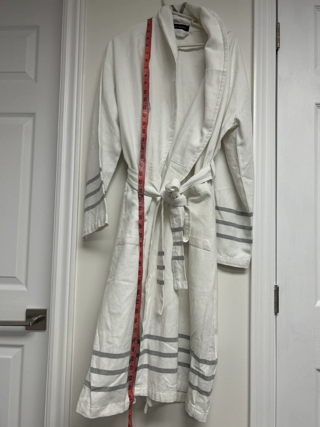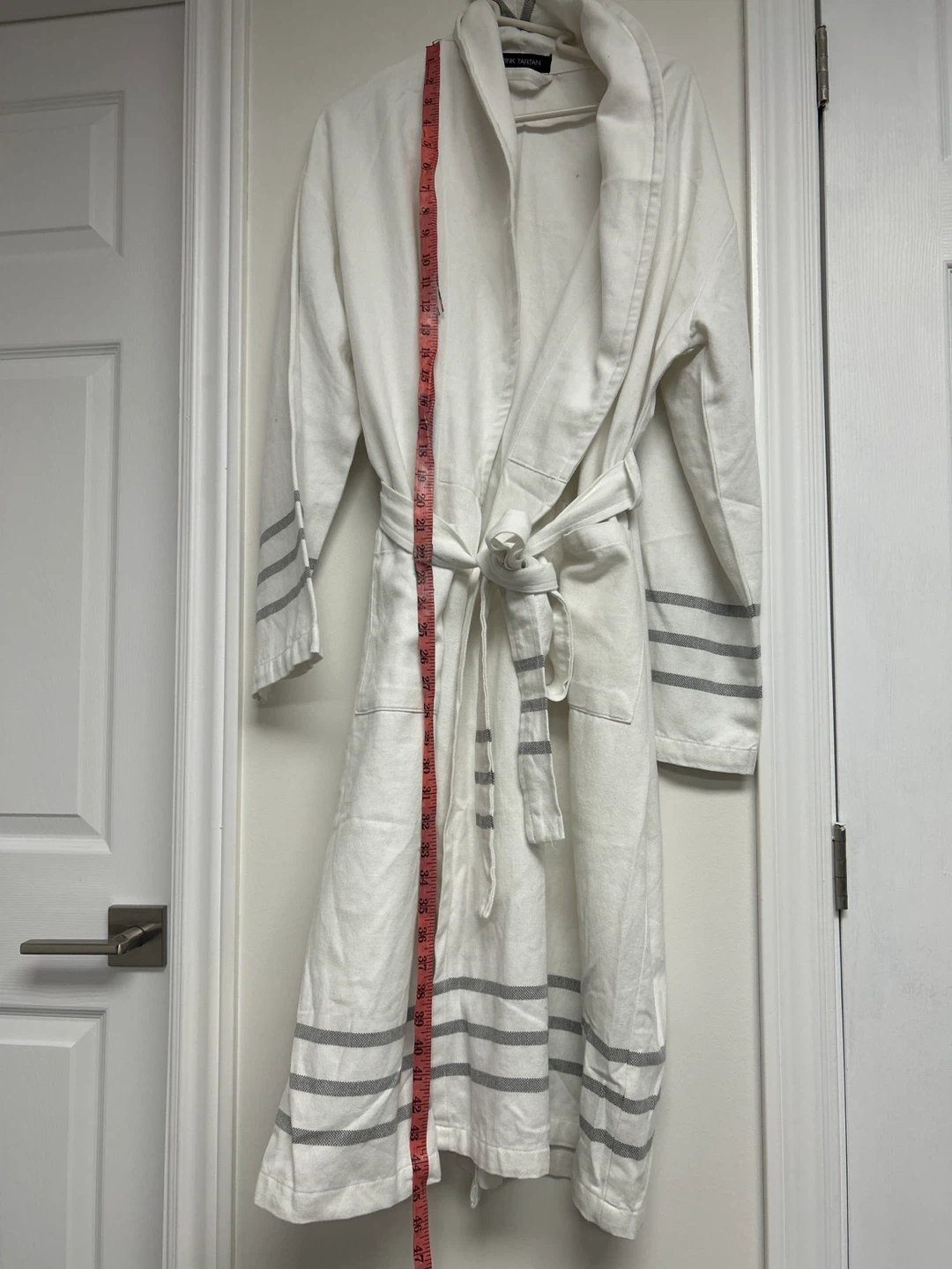 This white Pink Tartan robe features grey striped cuffs and hem. It includes a tie belt and pockets. Approximate length is 45 inches.