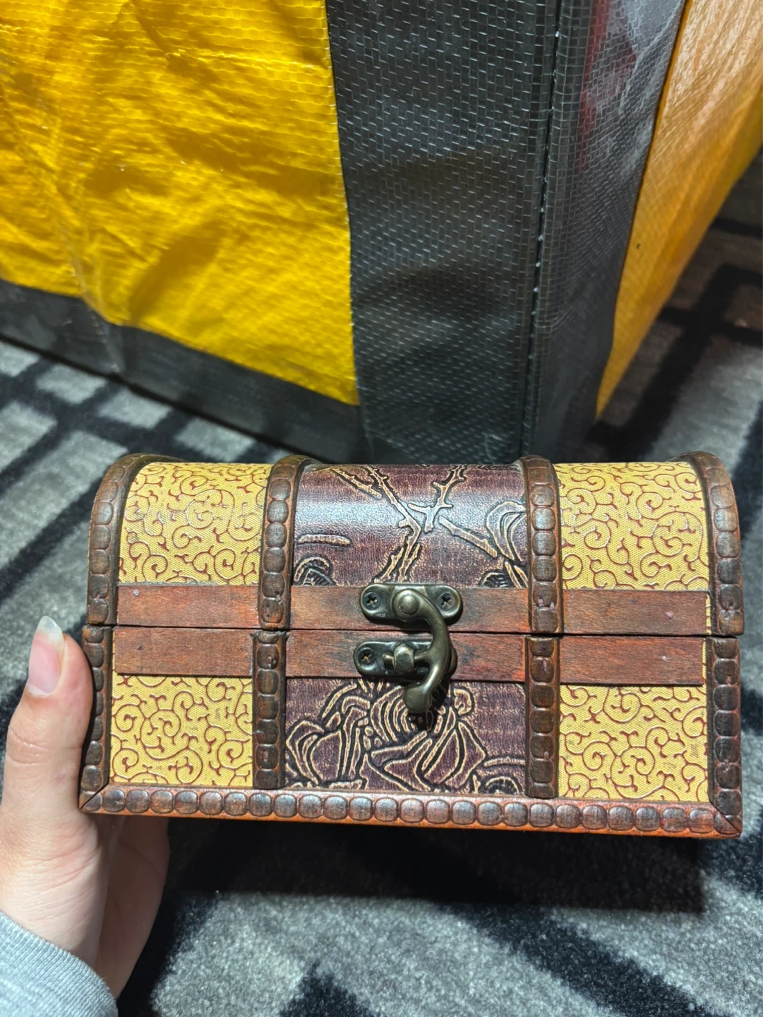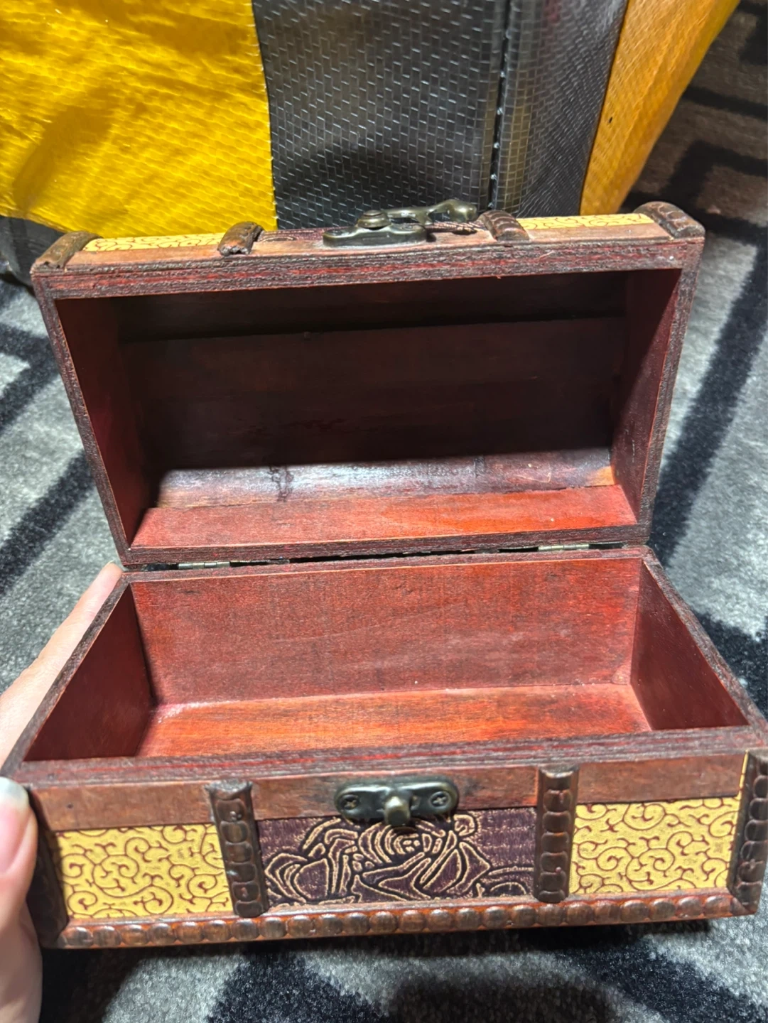 A small, decorative wooden chest with a vintage design. It's perfect for storing small trinkets or keepsakes. The exterior has intricate patterns and a metal latch closure.
