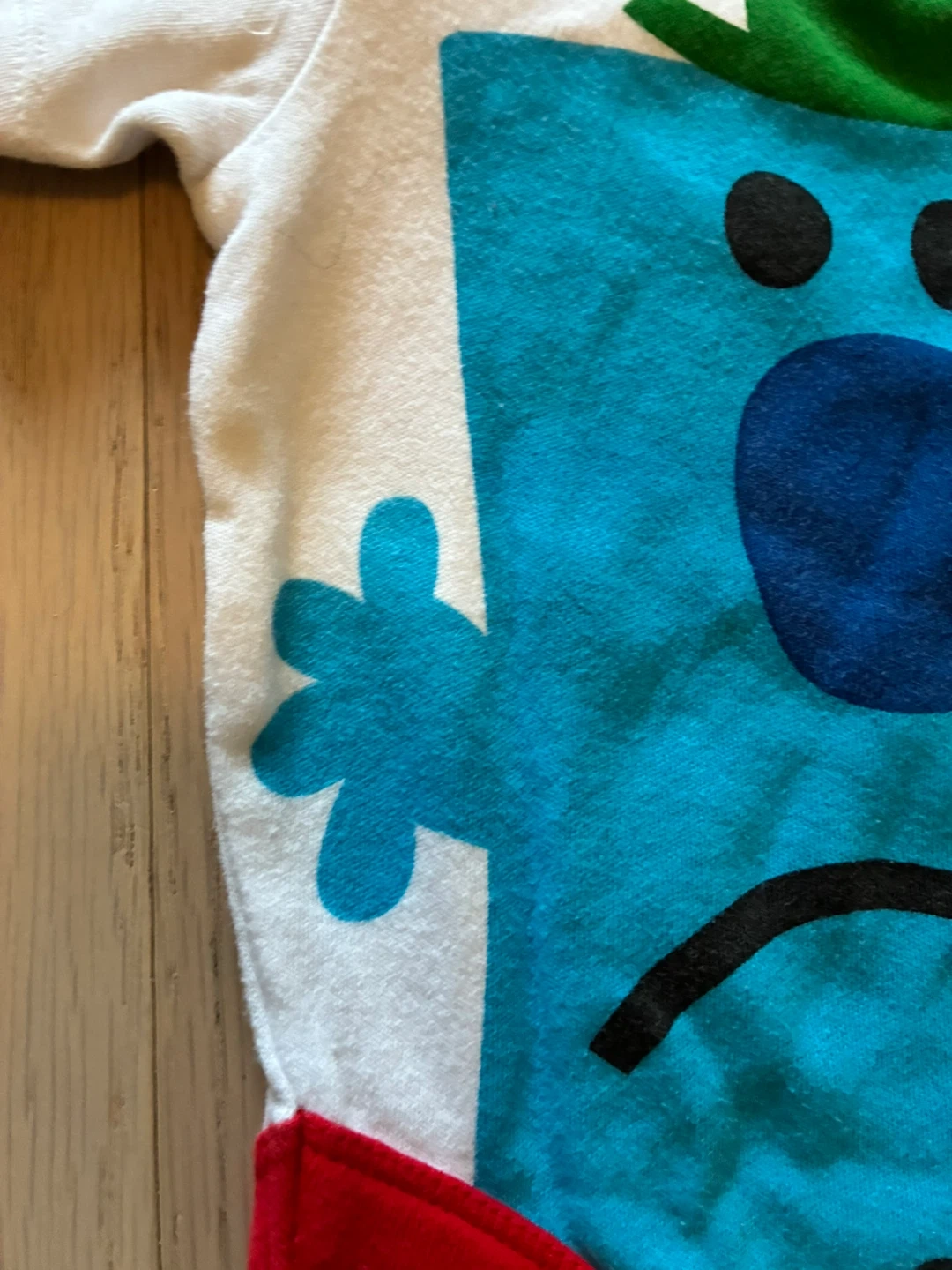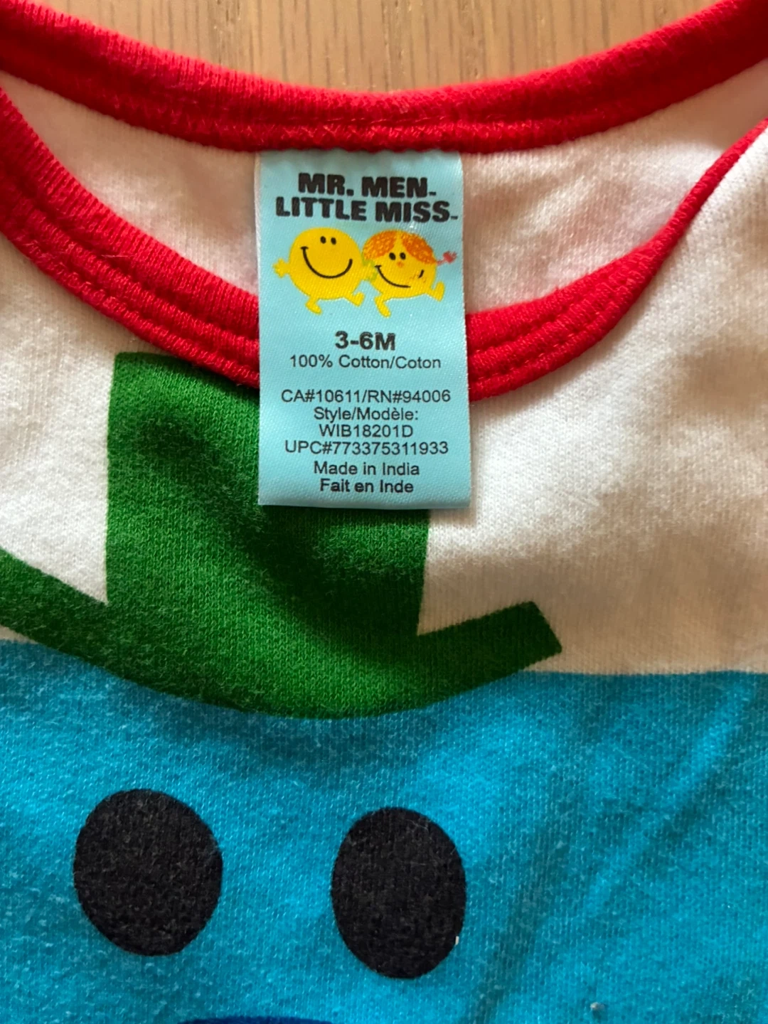 This "Mr. Men Little Miss" bodysuit features the "Mr. Grumpy" character. It's white with red trim and green hat detail. 100% cotton. Size is 3-6 months.