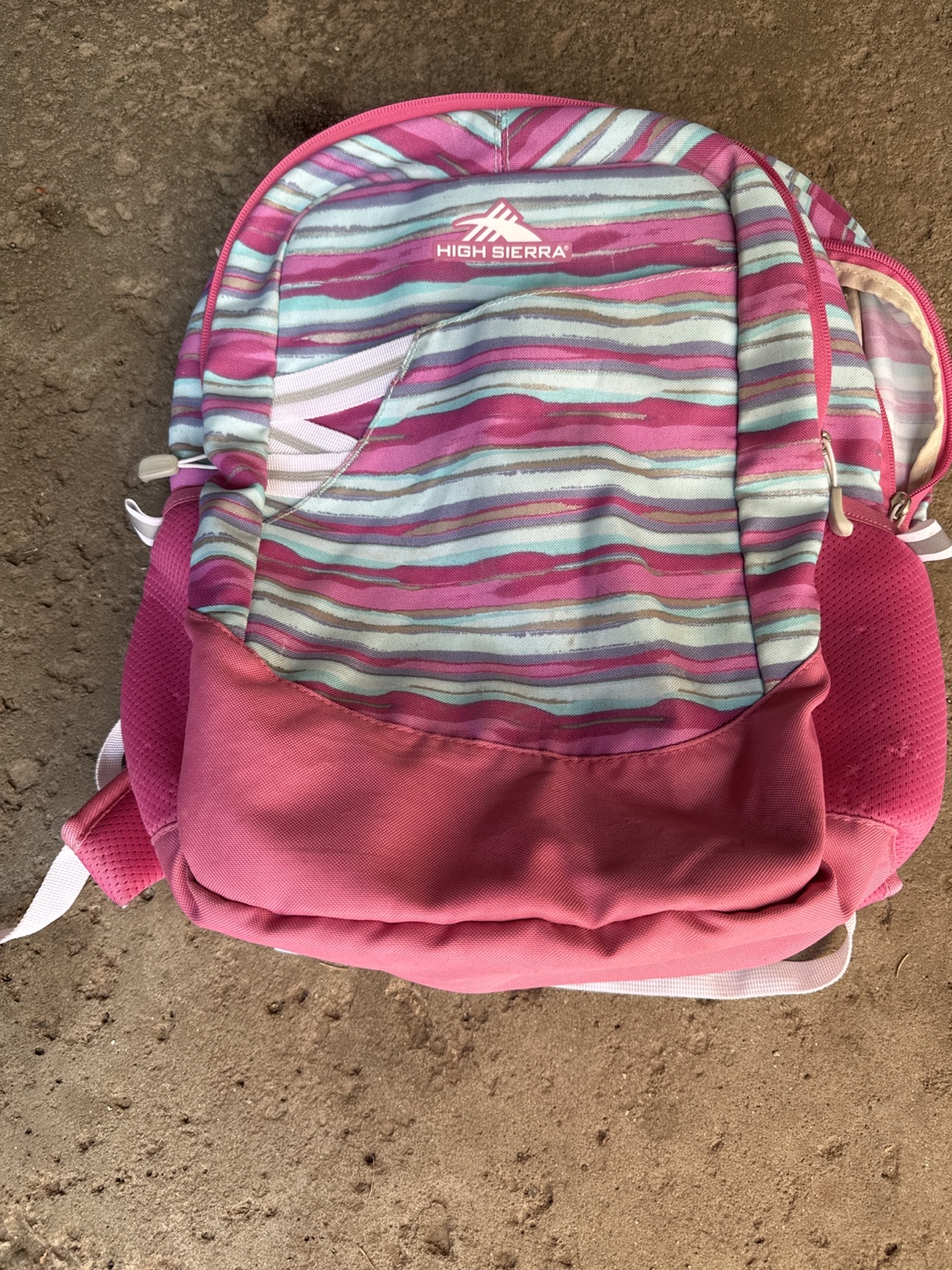 Here's a High Sierra backpack with a unique striped design in shades of pink, purple, and teal. It's perfect for school, travel, or everyday use. It features a front pocket and adjustable straps for a comfortable fit. Ready for a new adventure!