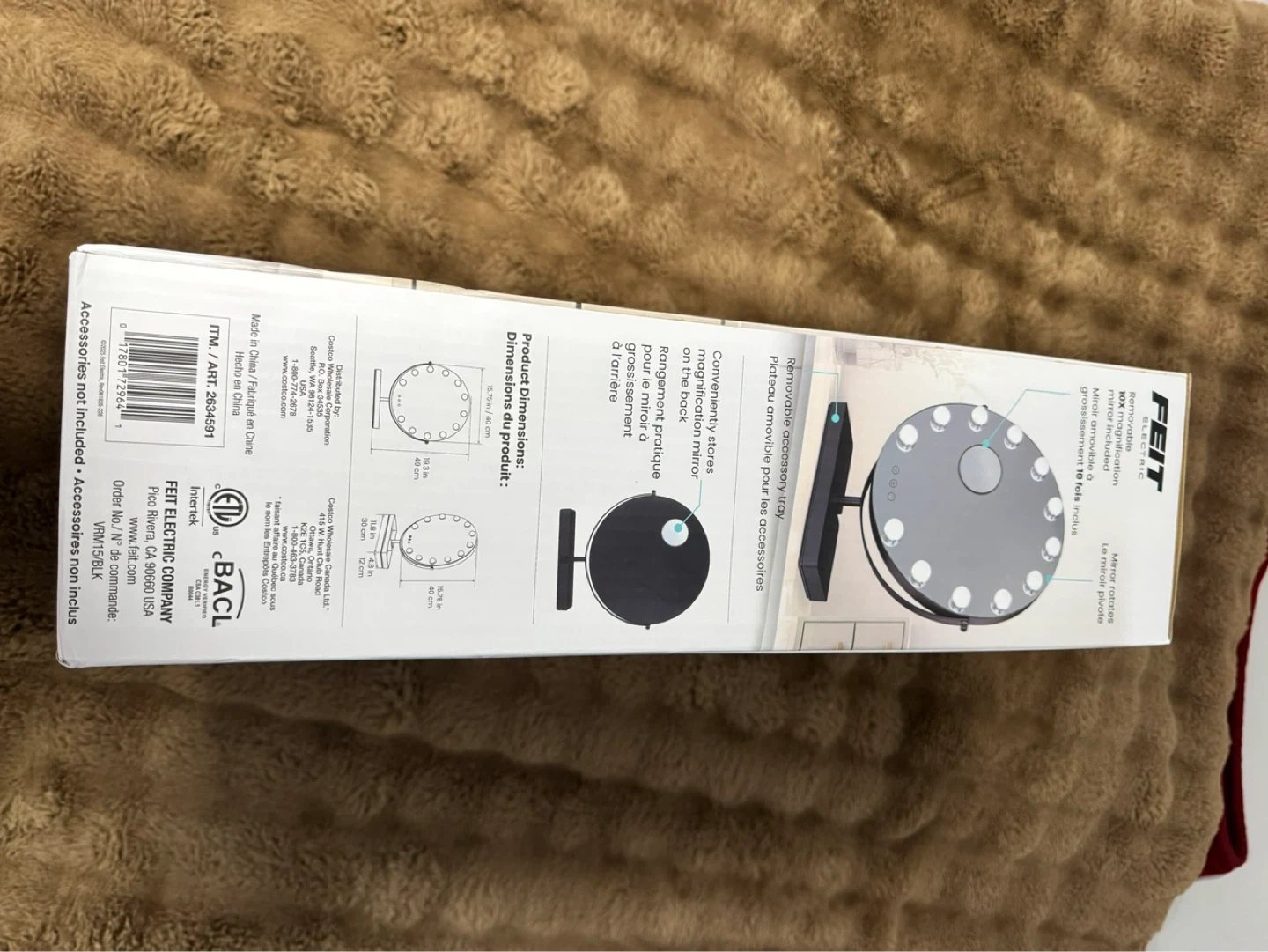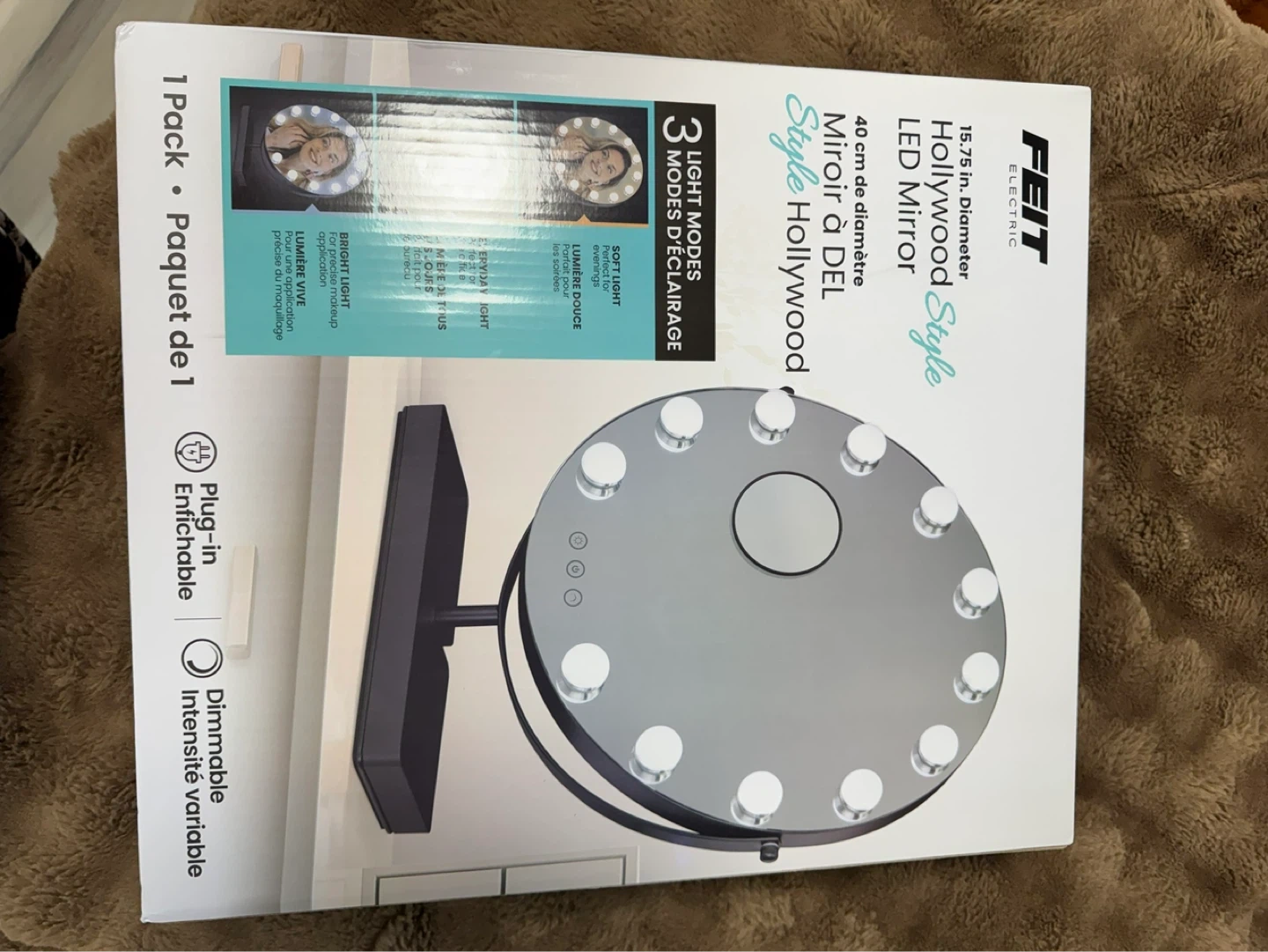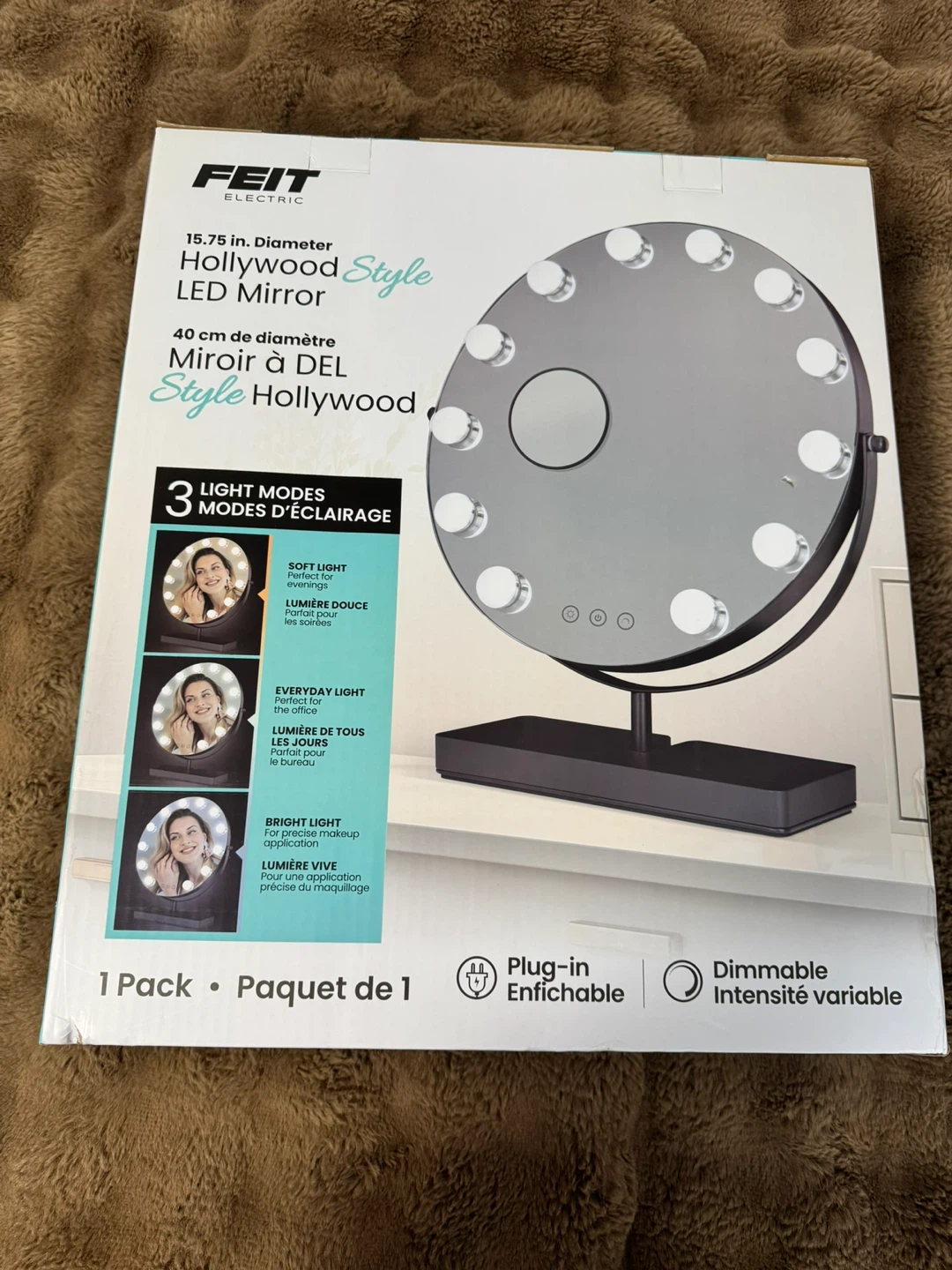This FEIT ELECTRIC Hollywood Style LED Mirror is 15.75 inches in diameter. It offers 3 light modes: soft light, everyday light, and bright light. The mirror is dimmable and plug-in. Perfect for precise makeup application!
