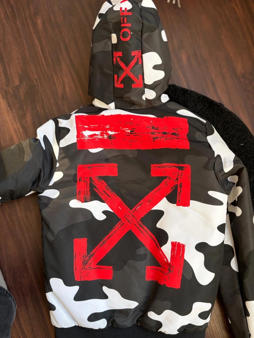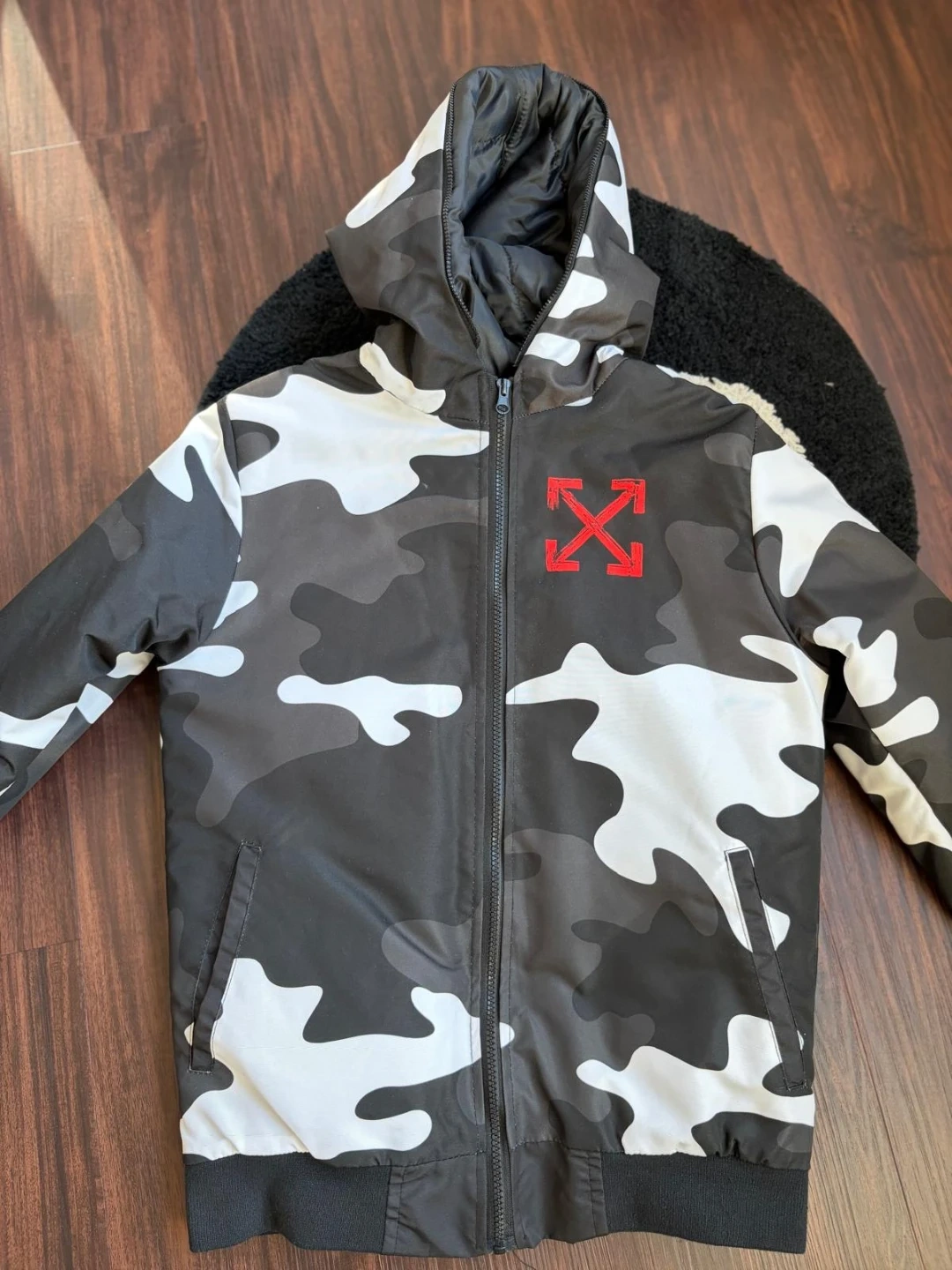 Selling an Off-White camo jacket in size small. The jacket features a black, white, and grey camouflage pattern with red Off-White logos. It's in great condition and ready for a new owner!
