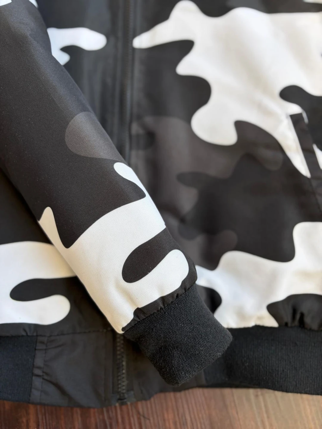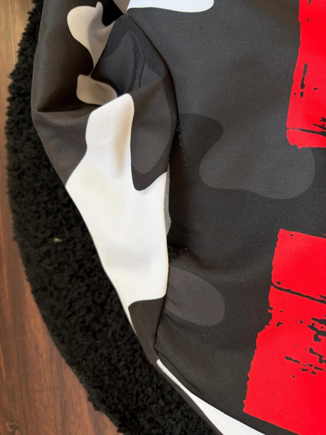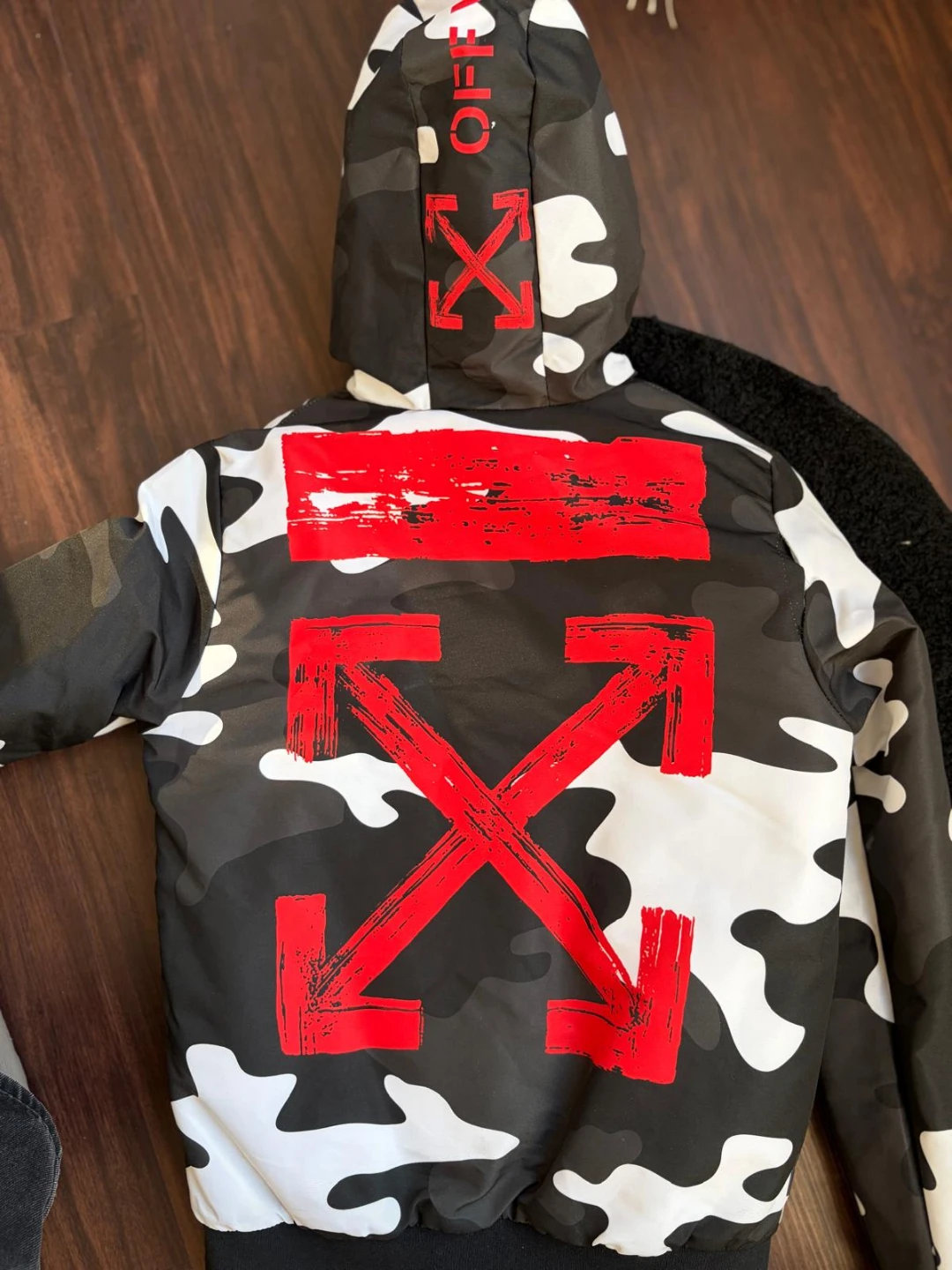 Selling an Off-White camo jacket in size small. The jacket features a black, white, and grey camouflage pattern with red Off-White logos. It's in great condition and ready for a new owner!