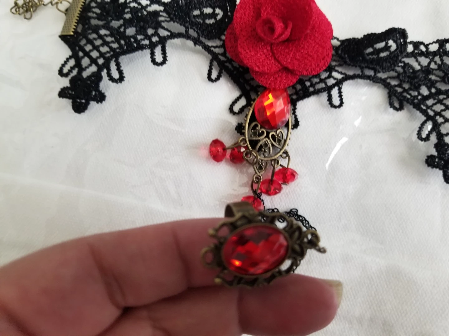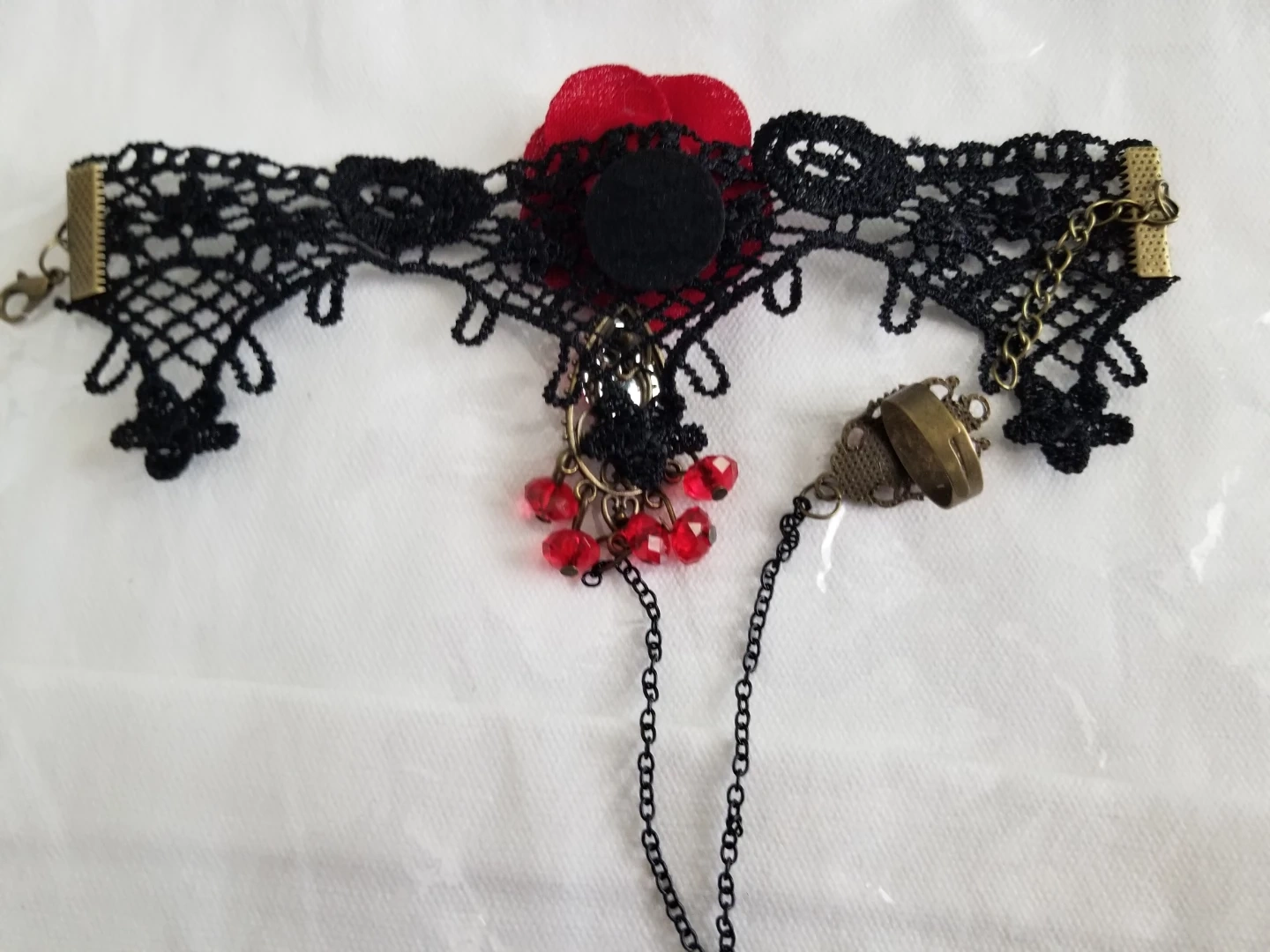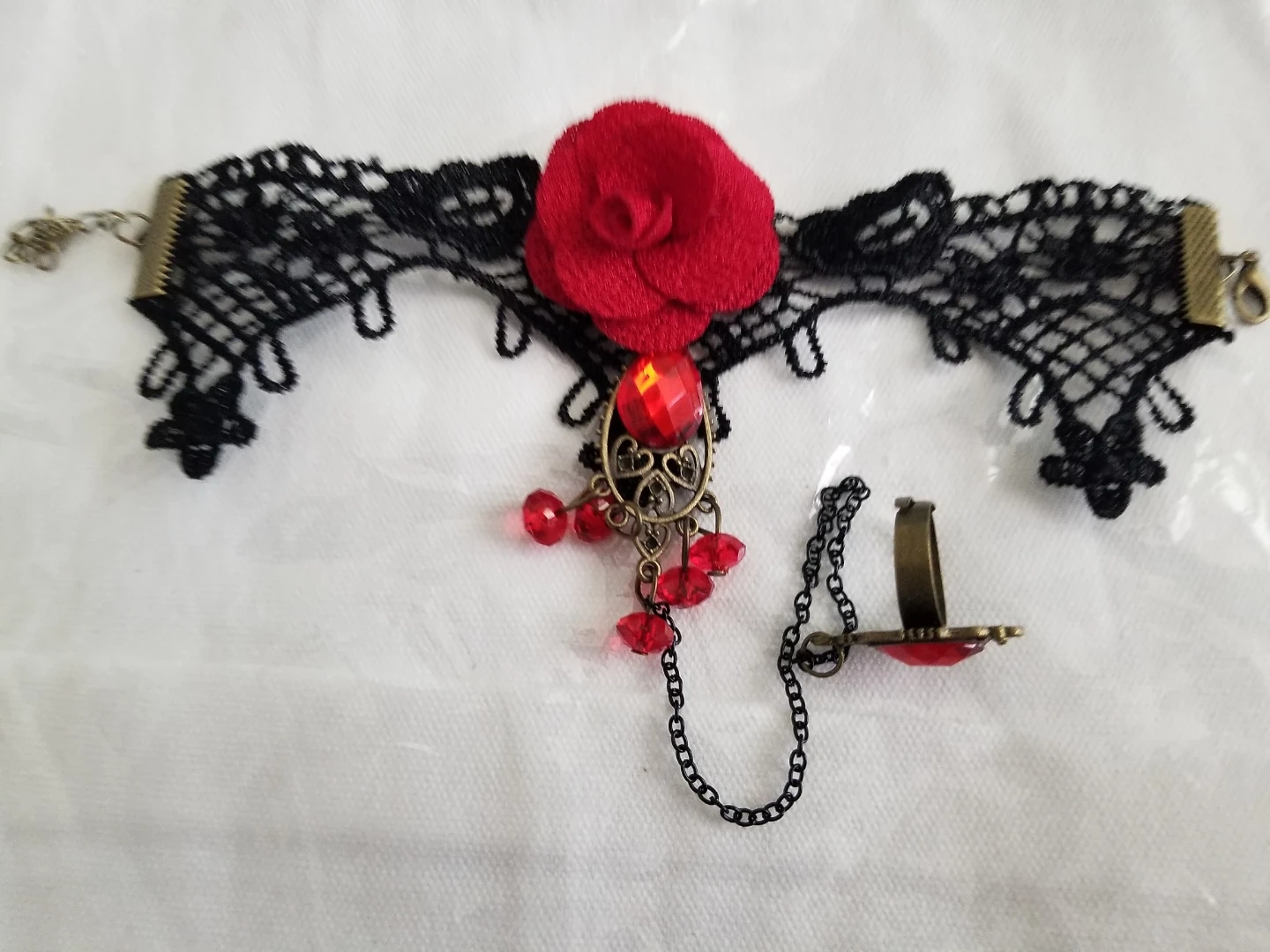 Black lace Bracelet featuring a red fabric rose and dangling red beads. Includes a matching ring connected by a chain. This piece adds a gothic flair to any outfit!
