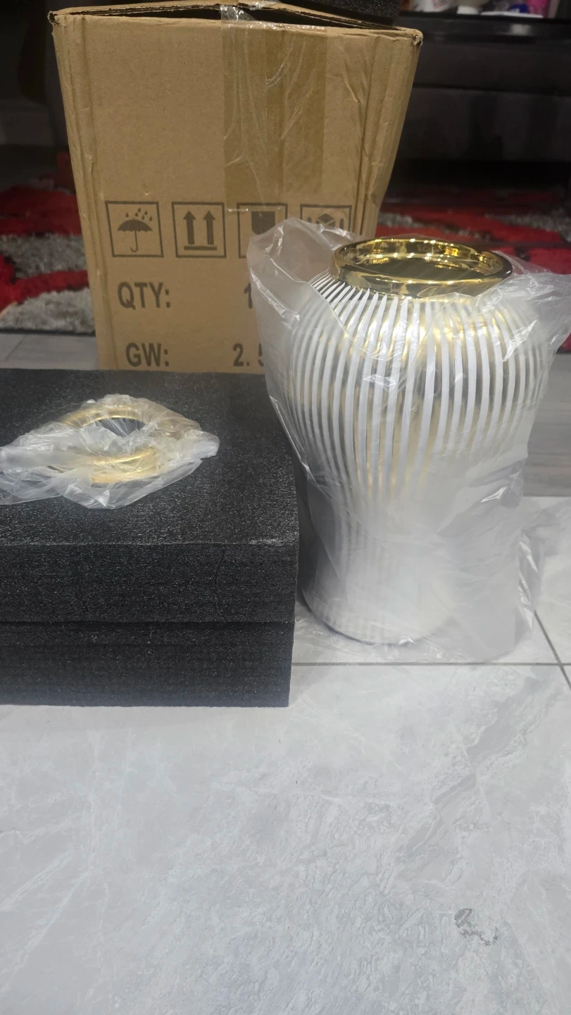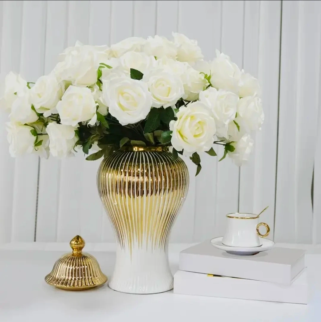 White and gold decorative ginger jar with a lid. This stylish ceramic piece stands 36cm (14.17 inches) tall and is 18cm (7.09 inches) wide. It's perfect for adding an elegant touch to your home decor. This jar comes in its original packaging with foam protection.