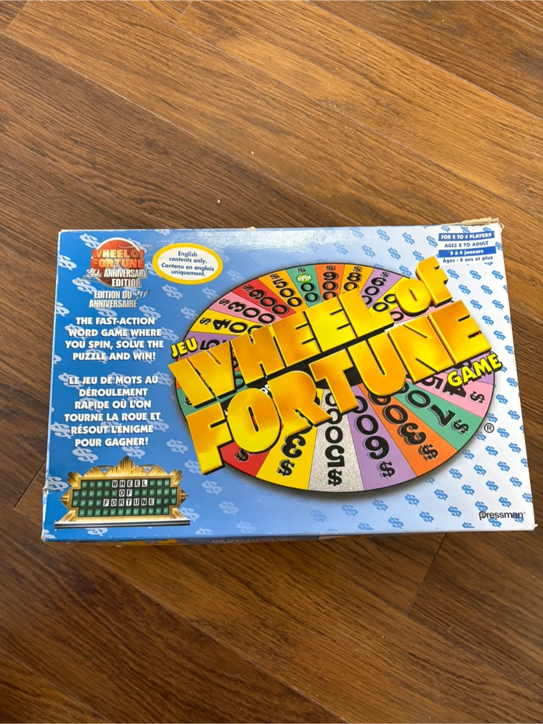 This is the Wheel of Fortune 30th Anniversary Edition board game. The box has seen better days but the game is intact.