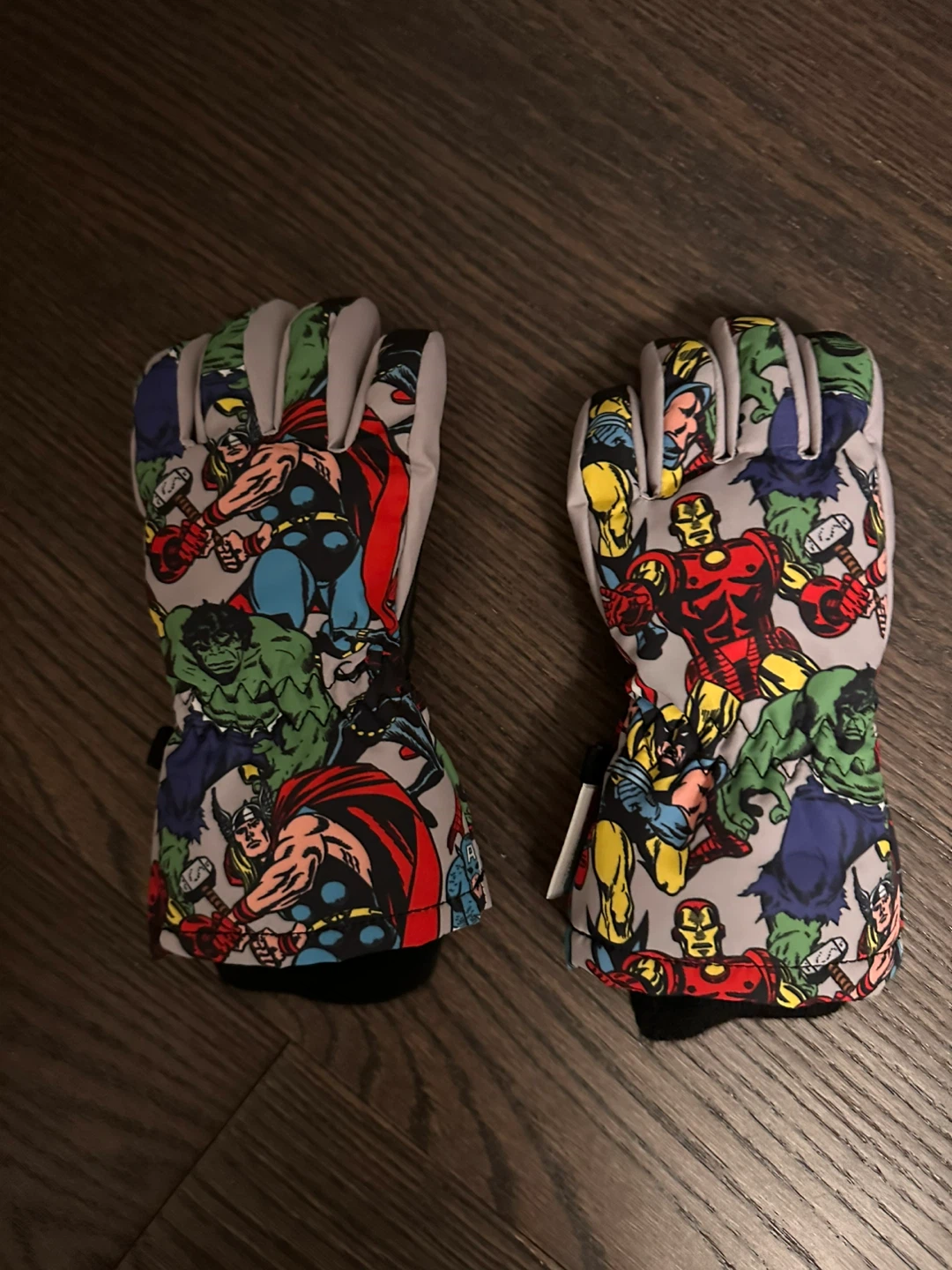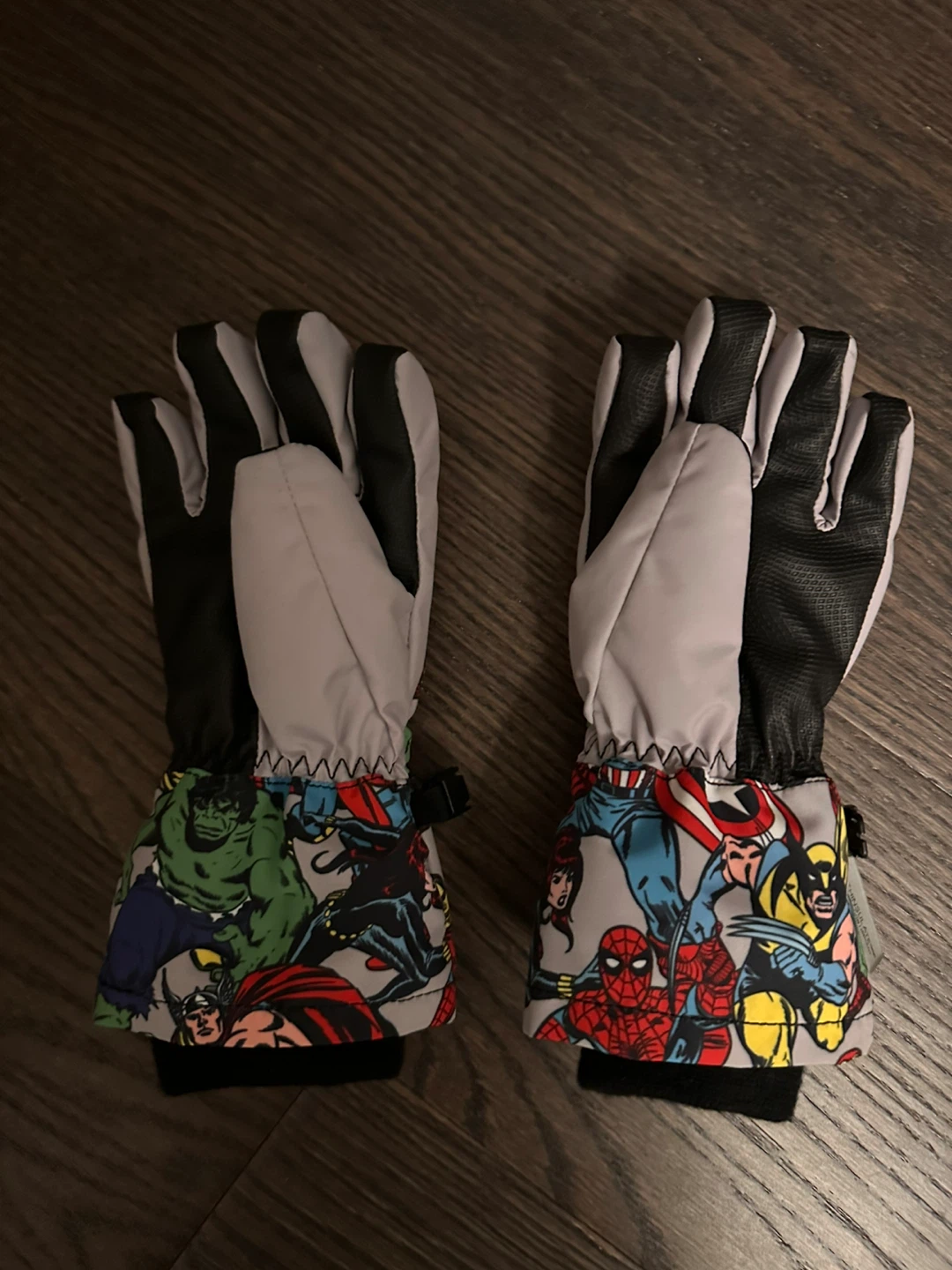 Selling a pair of Marvel-themed kids' winter gloves! They feature a fun print with popular characters like Hulk, Spider-Man, and Iron Man. These gloves are perfect for keeping little hands warm during the colder months.