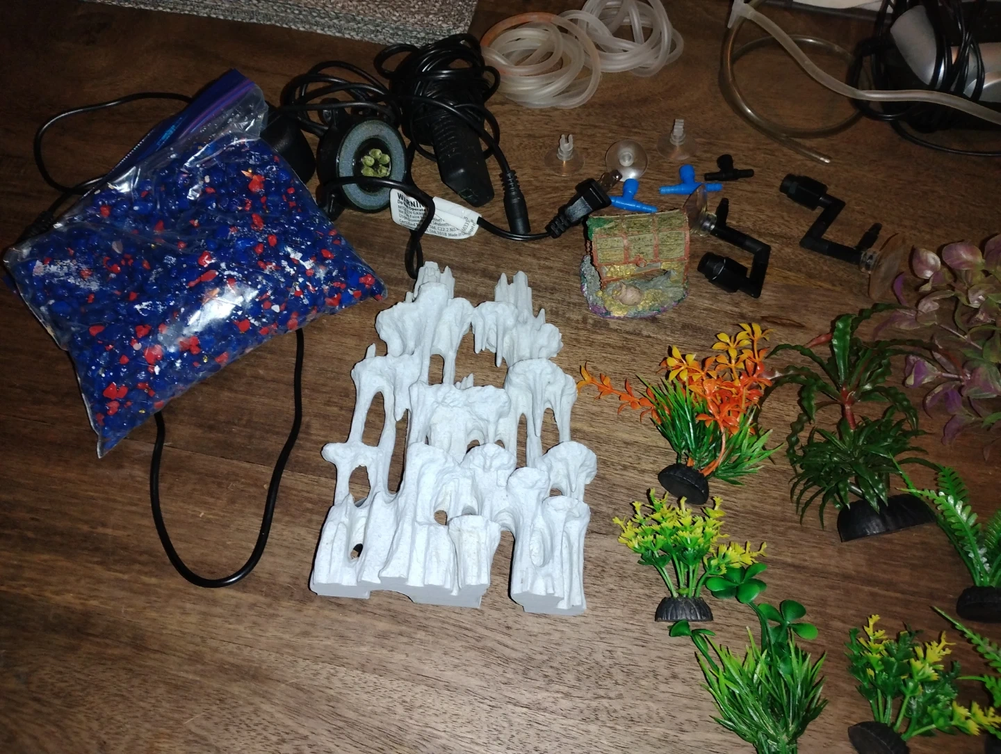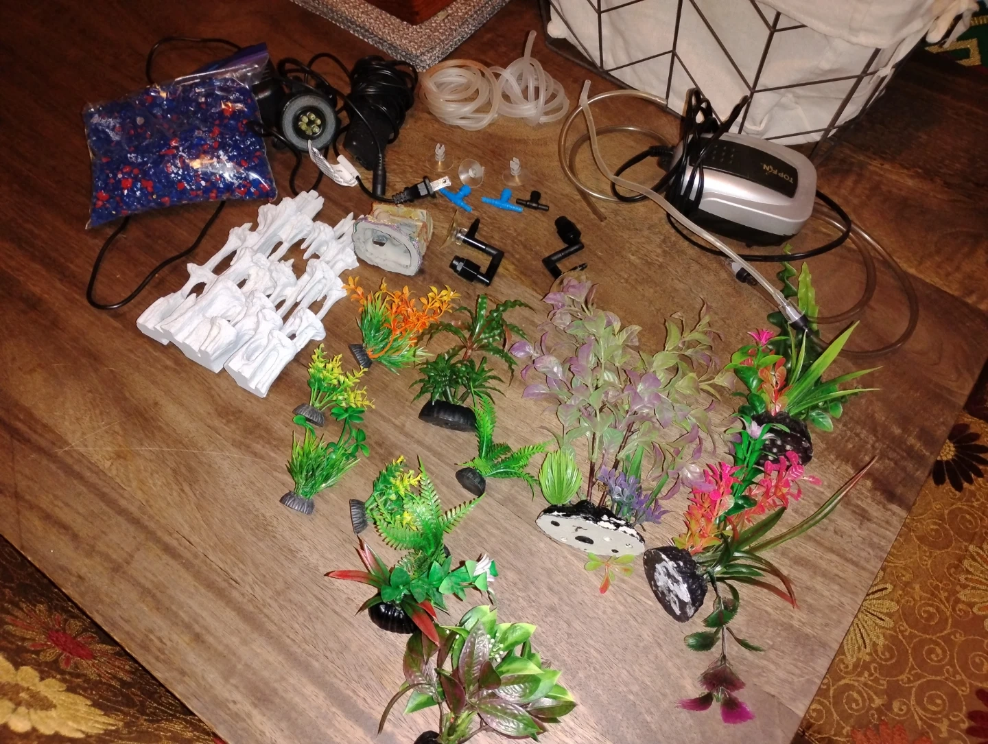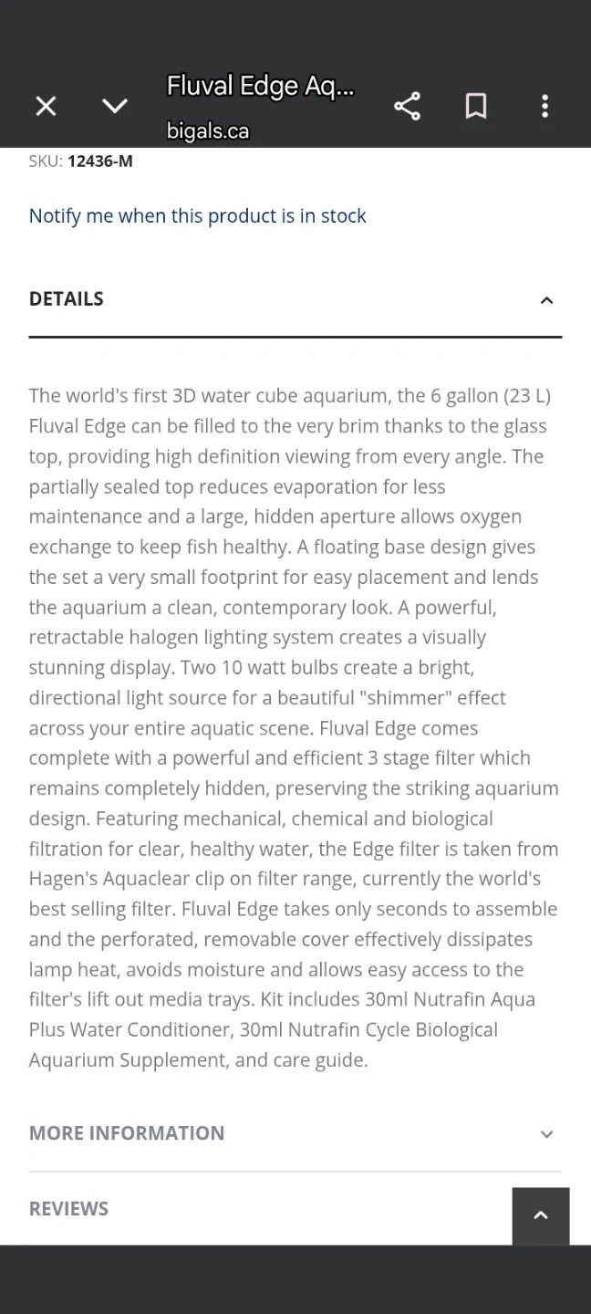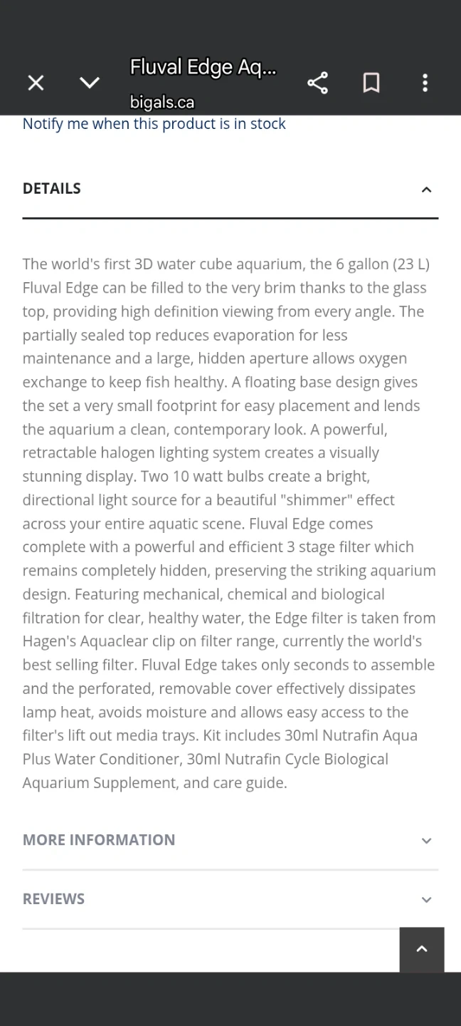 This is a Fluval Edge aquarium, a 6-gallon (23 L) 3D water cube. It comes with integrated LED lighting and a 3-stage filter. Also included are various aquarium decorations, a power air pump, tubing, and water conditioner. Kit includes 30ml Nutrafin Aqua Plus Water Conditioner, 30ml Nutrafin Cycle Biological Aquarium Supplement, and a care guide. Including $150 of extras