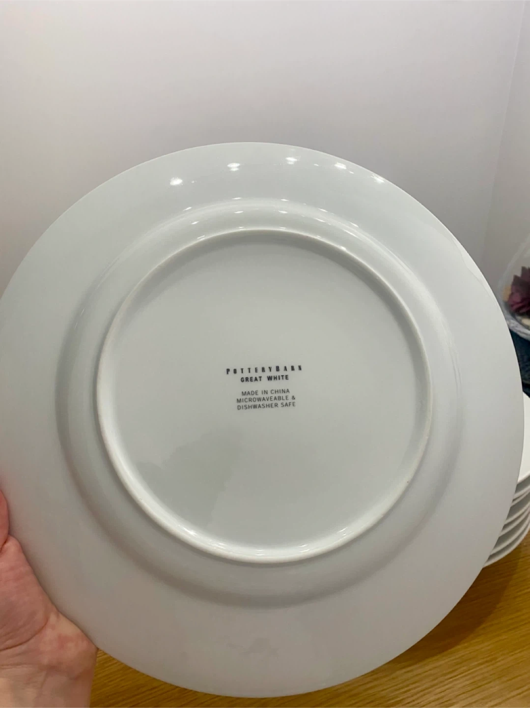 Set of eight white dinner plates from Pottery Barn. The classic shape and colour would make an excellent start to any dining set. Microwave and dishwasher safe. Only used a handful of times - no scratches, chips or dents.