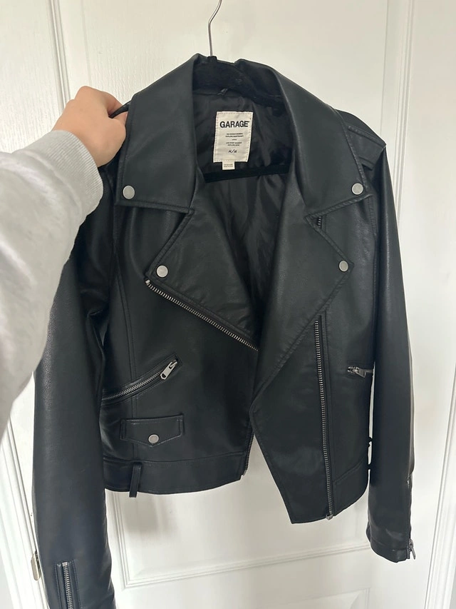 Medium size faux leather jacket from Garage. Worn once, in very good condition. 100% polyester. Available for pick up in the Durham Region.